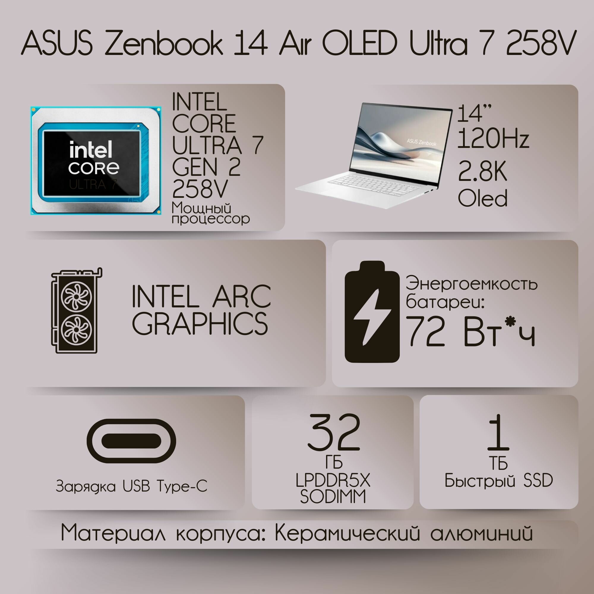 Ноутбук Asus Zenbook 14 Air, Intel Core Ultra 7 258V, Intel Arc Graphics, RAM 32 GB, SSD 1 TB, белый информация: