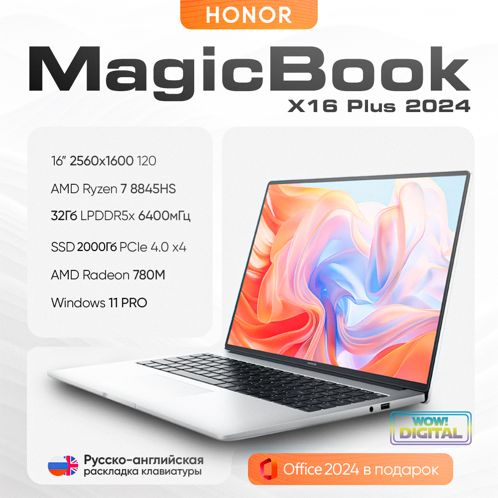 16" Ноутбук HONOR MagicBook 16X Plus 2024(2560x1600) AMD Ryzen 7 8845HS, RAM 32 ГБ, SSD 2000 ГБ, AMD Radeon 780M, Win11Pro + MS Office 2024, серебристый, Русско-английская раскладка информация: