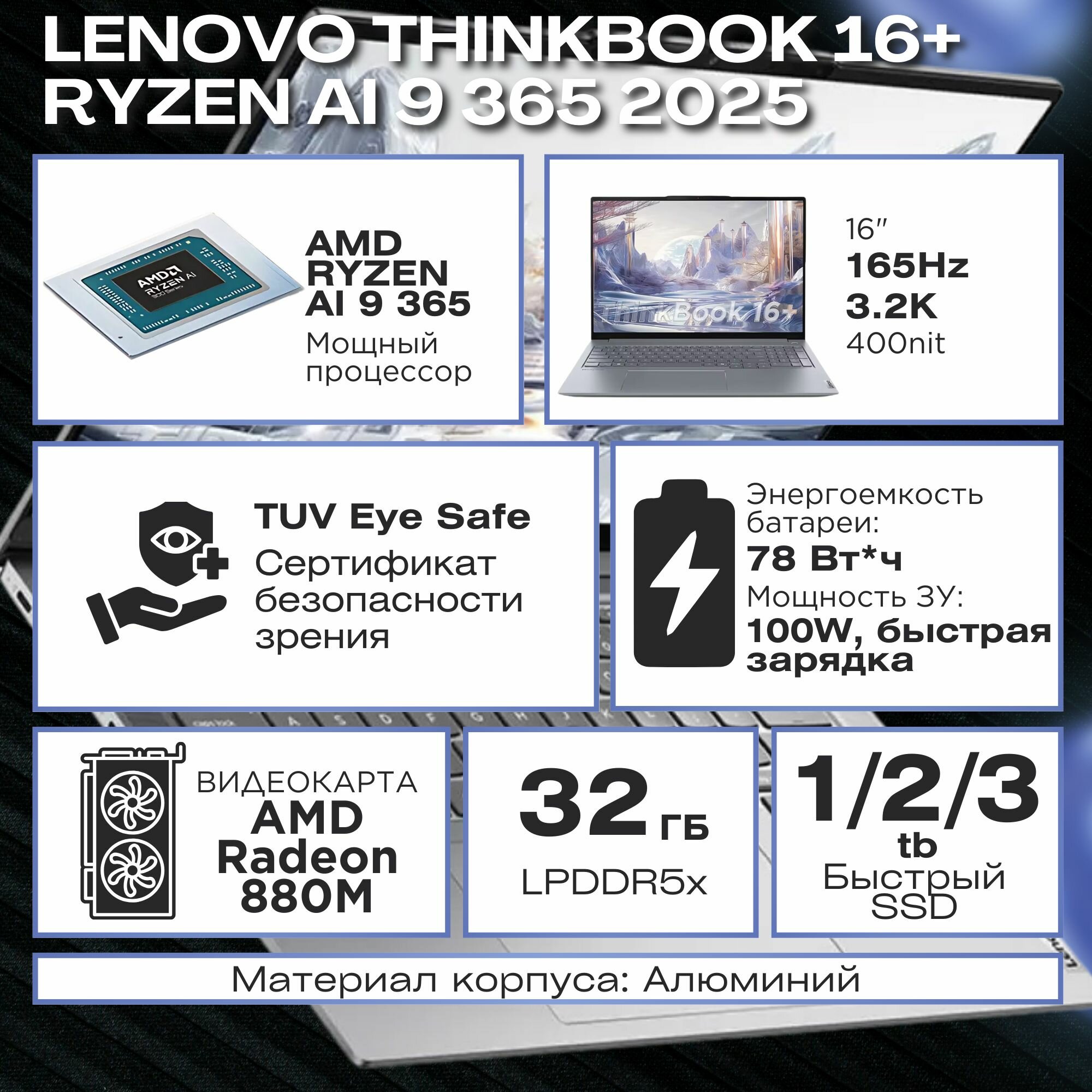 Ноутбук Lenovo Thinkbook 16+, AMD Ryzen AI 9 365, AMD Radeon 880M, RAM 32 ГБ, SSD 1 ТБ, серый информация: