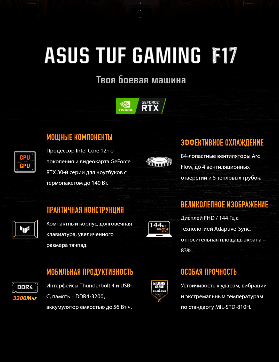 Отзывы на Игровой ноутбук Asus TUF Gaming F17 17.3 IPS 144Гц FHD Core i5-12500H 16ГБ 512ГБ GeForce RTX3050 Серый Без ОС