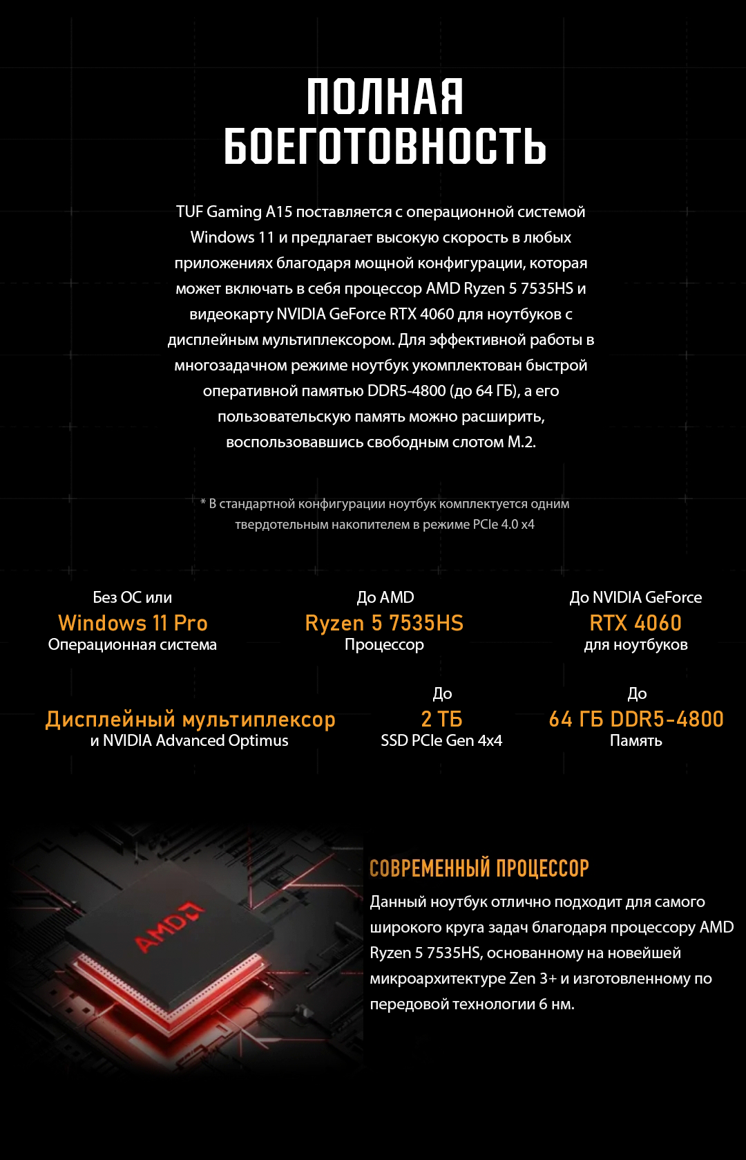 Игровой ноутбук Asus TUF Gaming A15 15.6 IPS 144Гц FHD Ryzen 5 7535HS 32ГБ 2ТБ GeForce RTX 4060 Чёрный Windows11+Office информация: