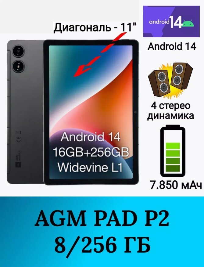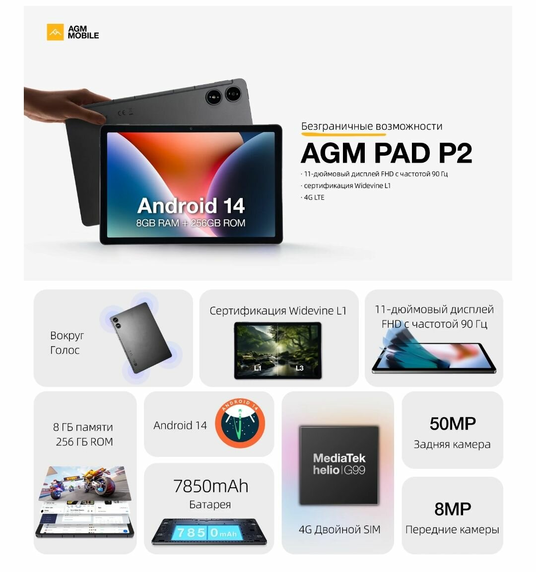 Планшет AGM Pad P2 серый 8+8/256 ГБ, 4G LTE ,11" + Чехол+Клавиатура. Супер Легкий и Тонкий, Стереозвук, информация: