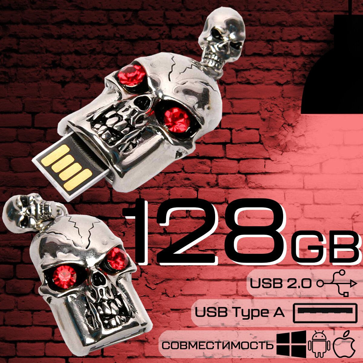 Металлическая флешка в виде "Черепа" с кристаллами (128 Гб / GB USB 2.0 Серебро/Silver SKULL) информация: