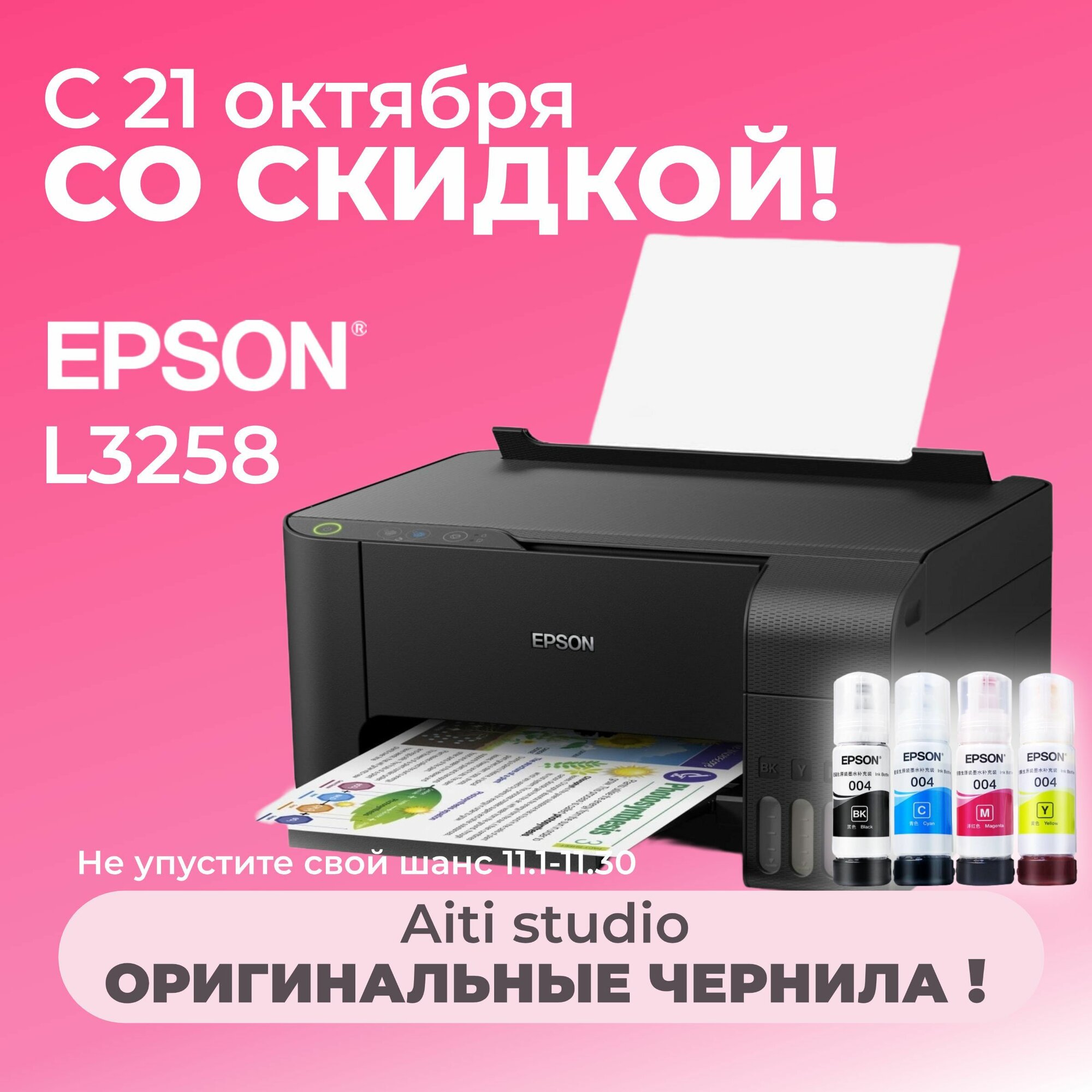 Epson МФУ Струйное L3258A4, Wi-Fi, USB с 4 флаконами оригинальных чернил, черный, серый металлик информация: