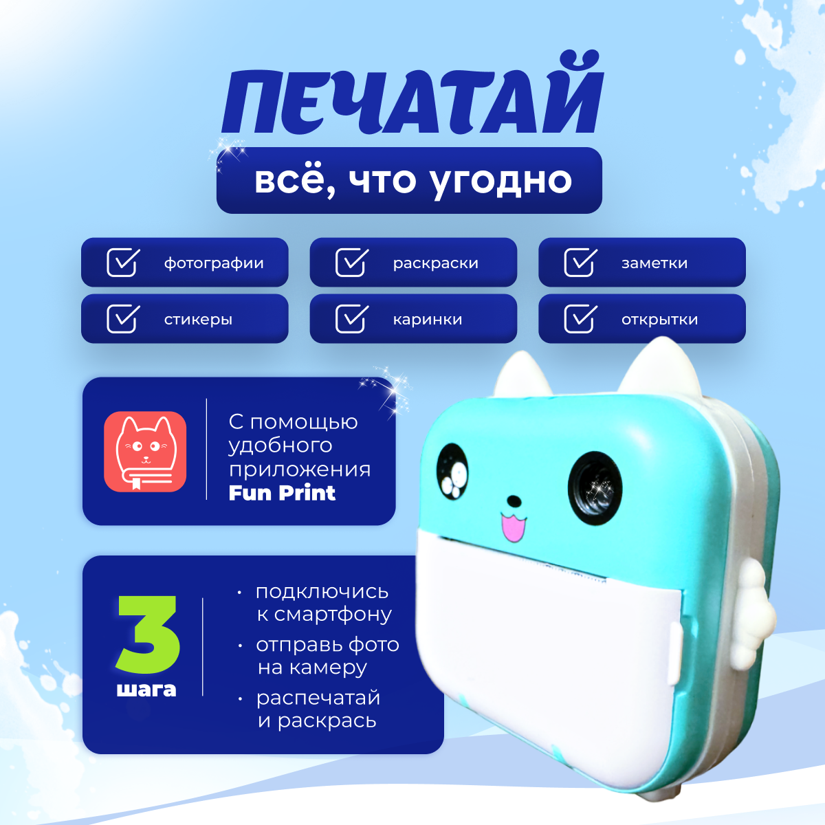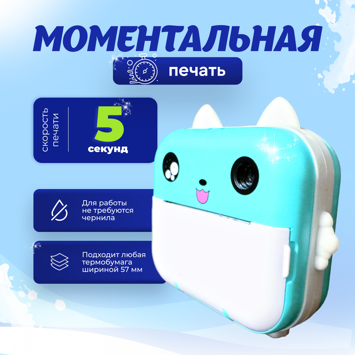 Детский фотопринтер с моментальной печатью, голубой, USB Type S информация: