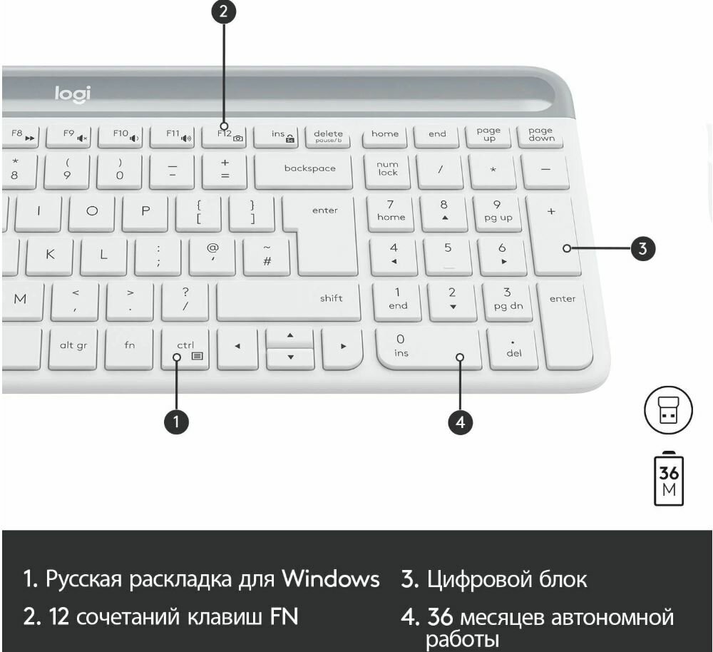 Комплект клавиатура + мышь Logitech MK470 Slim, , белый, кириллица+QWERTY информация: