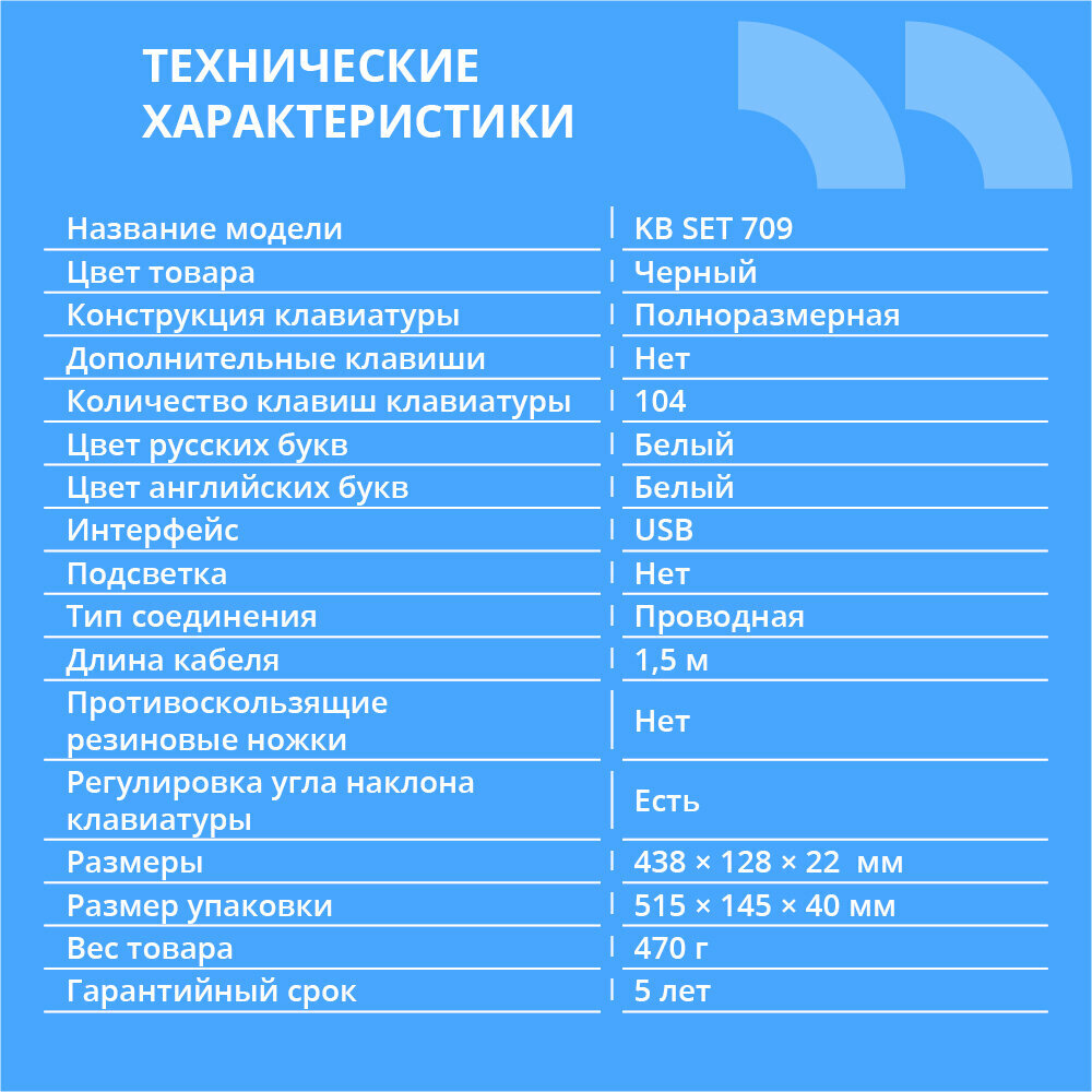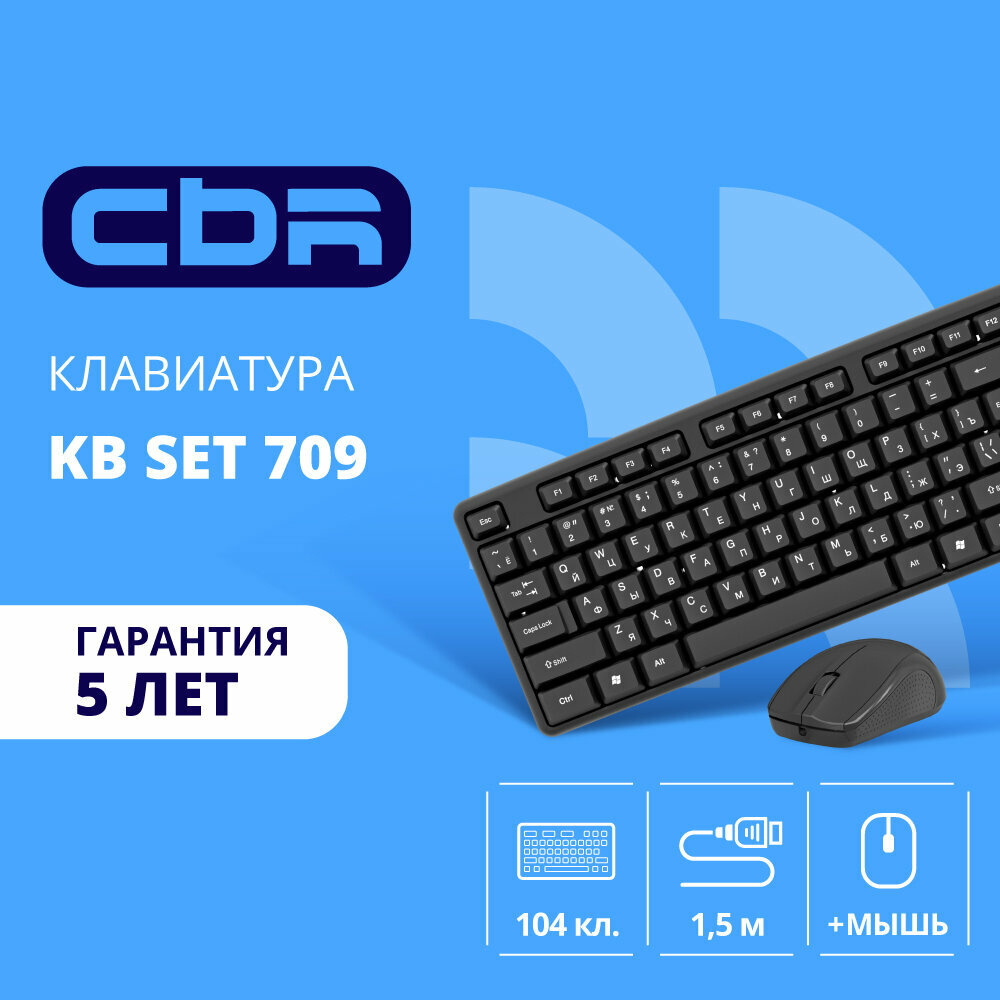 10 цен на Cbr Клавиатура KB SET 709, Комплект клавиатура + мышь , USB. Клавиатура: 104 кл, офисн, 1,5 м. Мышь: 1000 dpi, 3 кн, 1,5 м