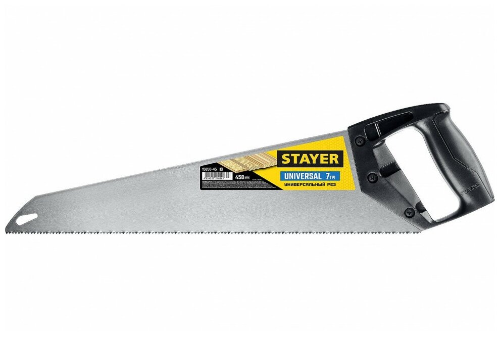 Ножовка по дереву (пила) STAYER "Universal", универсальная, 450мм,7TPI, закаленный зуб, рез вдоль и поперек волокон, для средних заготовок, фанеры, ДСП, МДФ информация:
