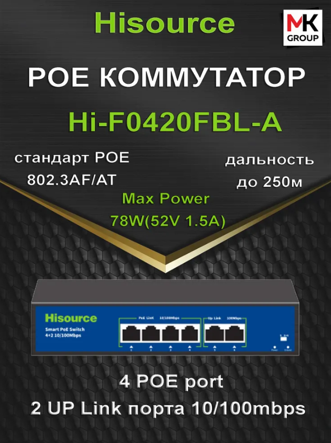 Коммутатор Hisourse Hi-F0420FBL-A PoE, скорость передачи 100Мбит/с, неуправляемый информация: