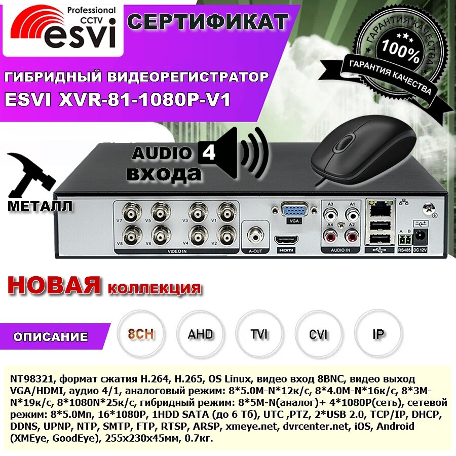 Видеорегистратор ESVI XVR-81-1080P-V1 гибридный, цифровой информация: