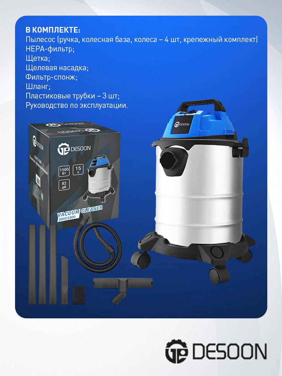 Пылесос промышленный DEKO DSVC-1500-15S, сухой, контейнер, 15л, 1500Вт информация:
