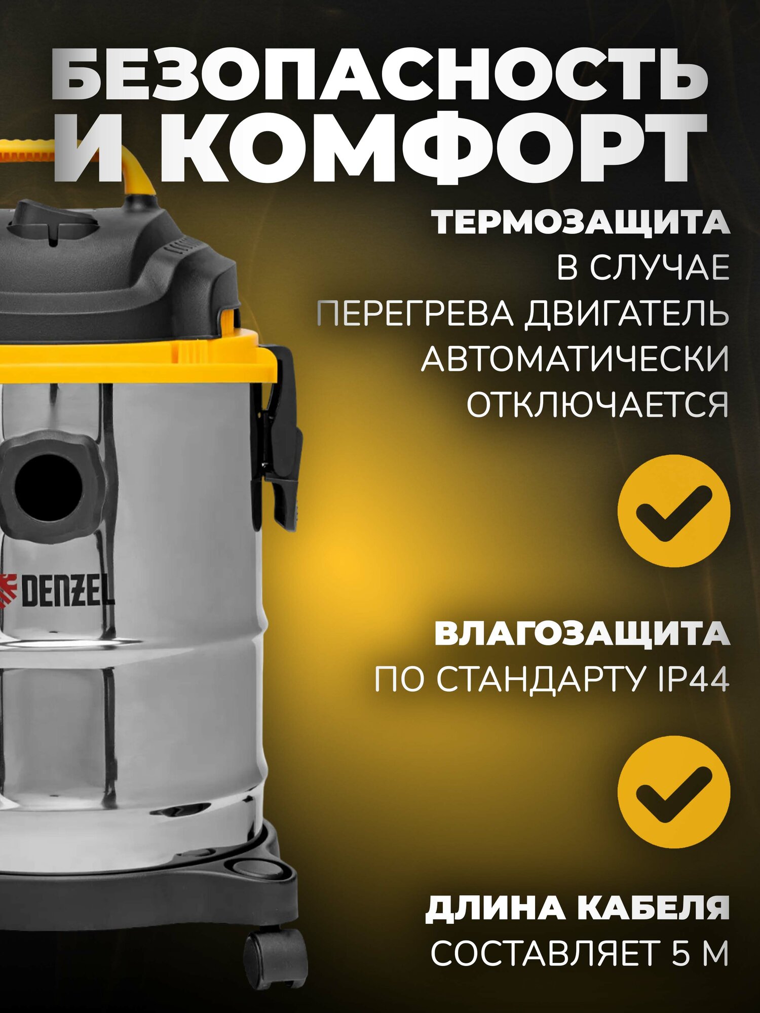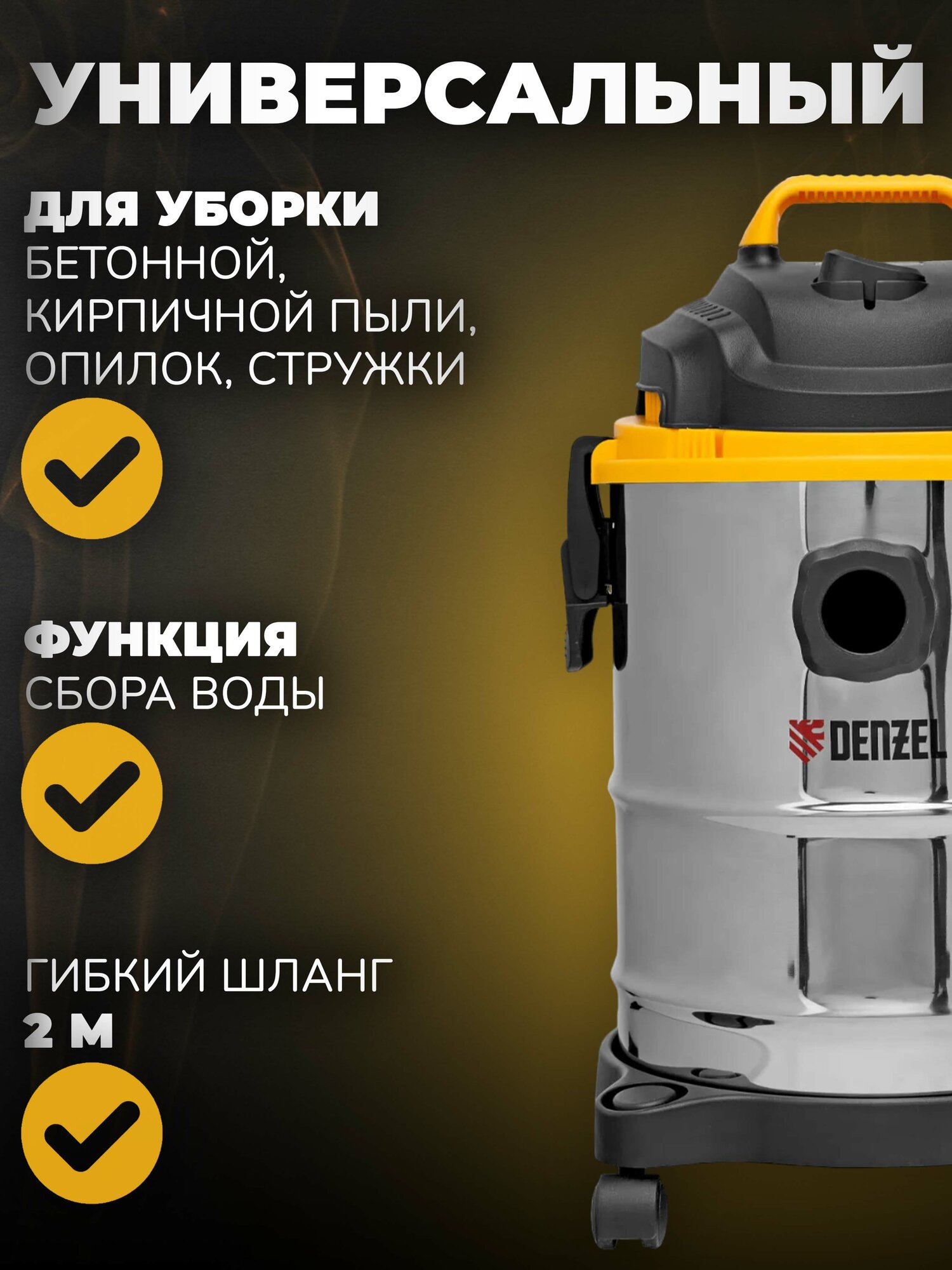 Отзывы на Пылесос строительный Denzel SVC15, профессиональный 1200 Вт, бак 15 л, шланг 2 м