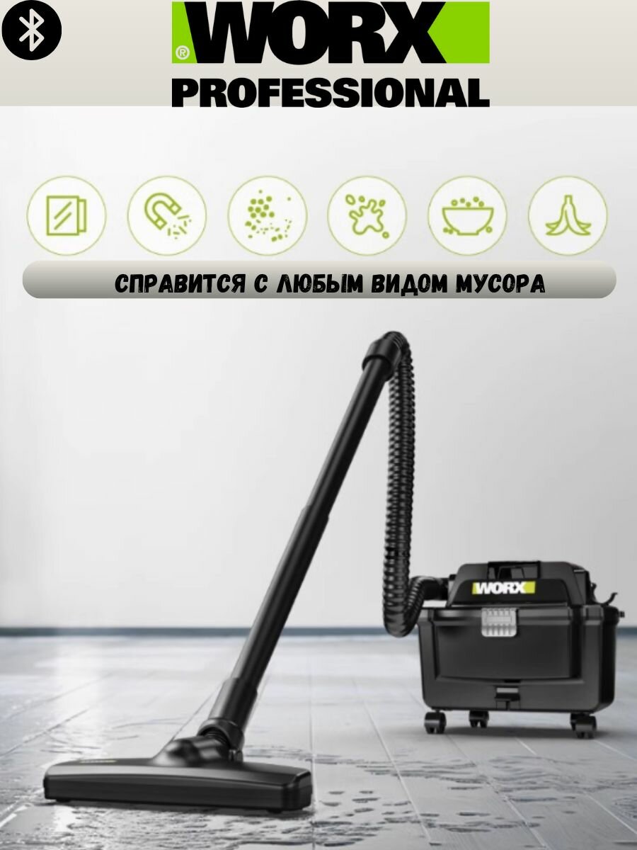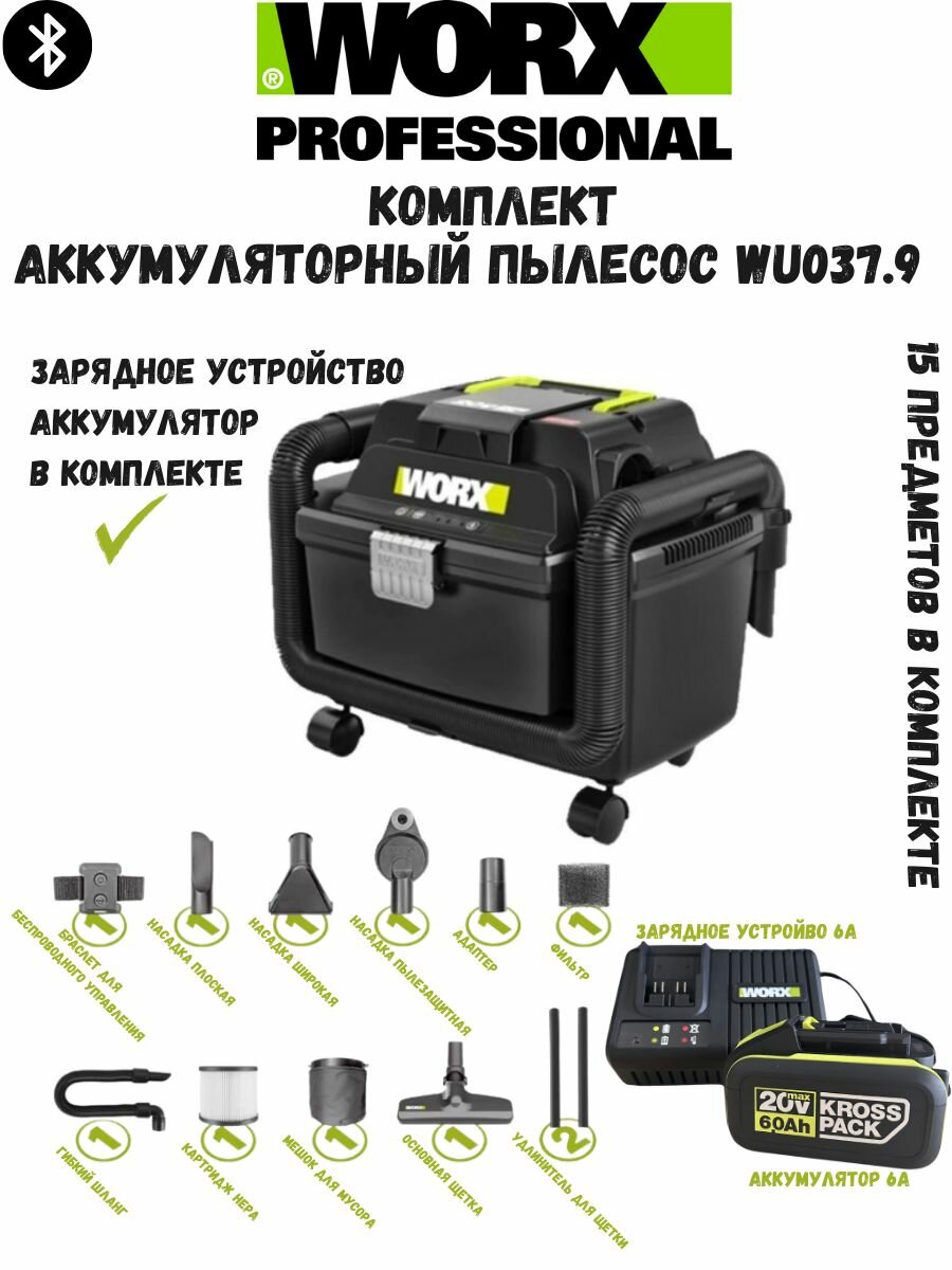 Строительный пылесос аккумуляторный WORX WU037.9 с зарядным усройством и аккумулятором 6А/ Профессиональный информация: