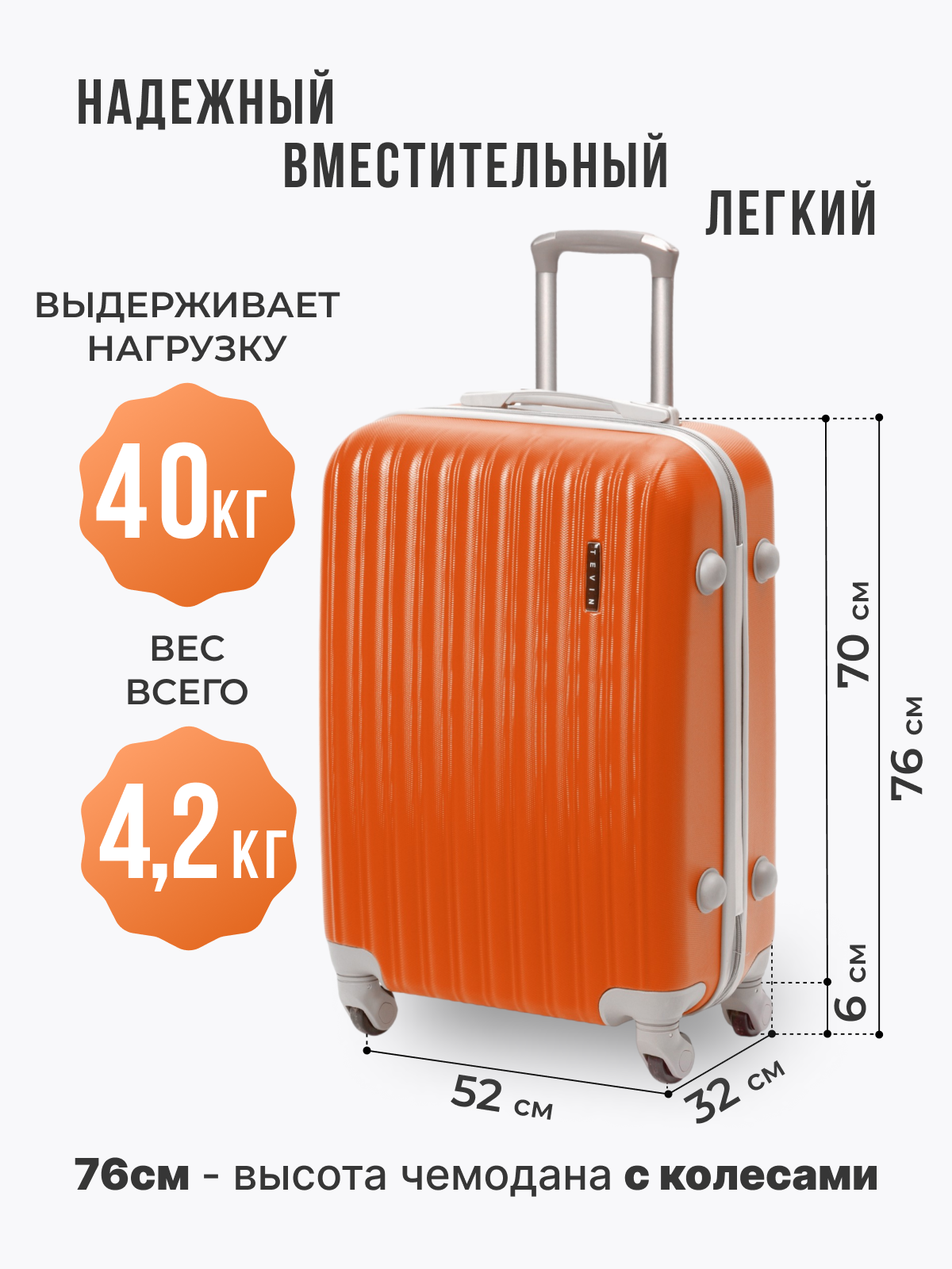 Чемодан TEVIN, 77 л, размер M+, коралловый 8 000 ₽