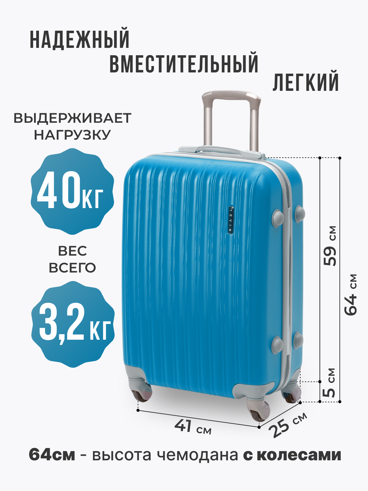 Чемодан TEVIN, 62 л, размер M, лазурный информация: