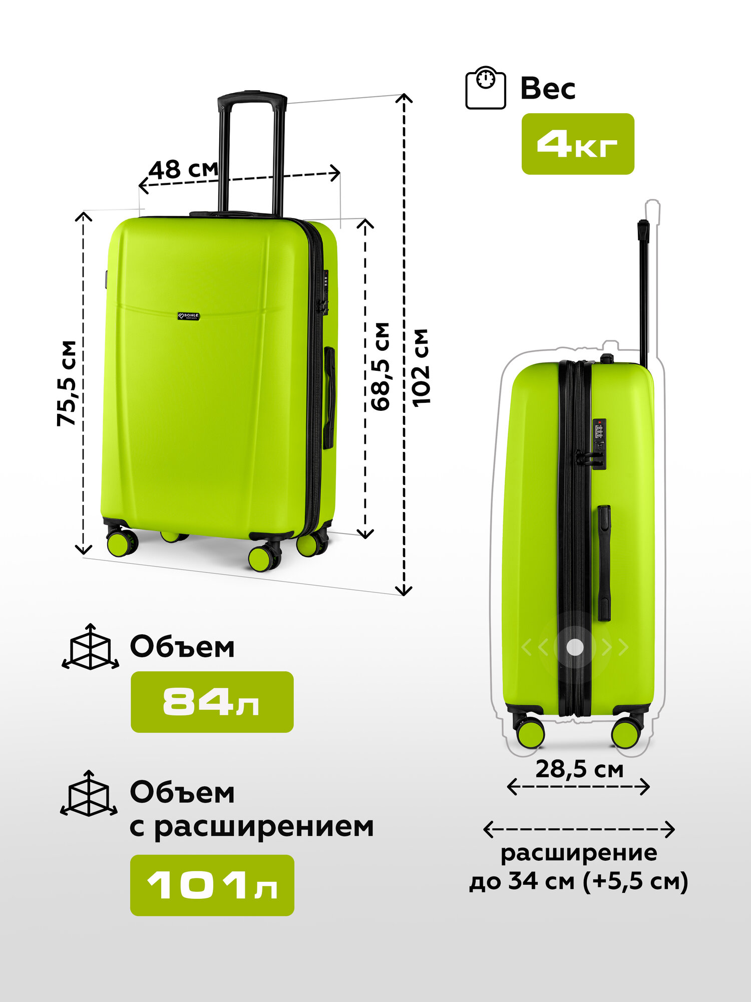 Чемодан Bonle, 101 л, салатовый информация: