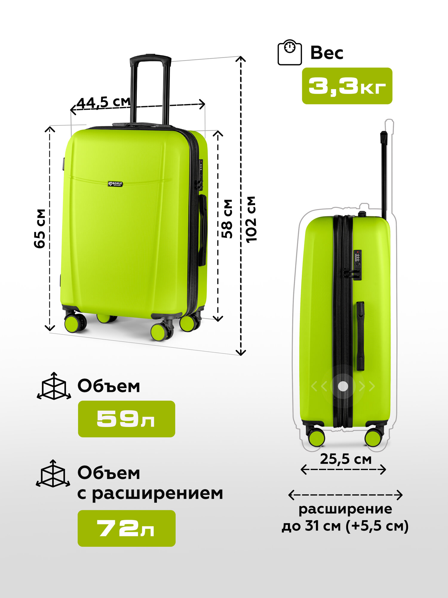 Чемодан Bonle, 101 л, размер XS, салатовый информация: