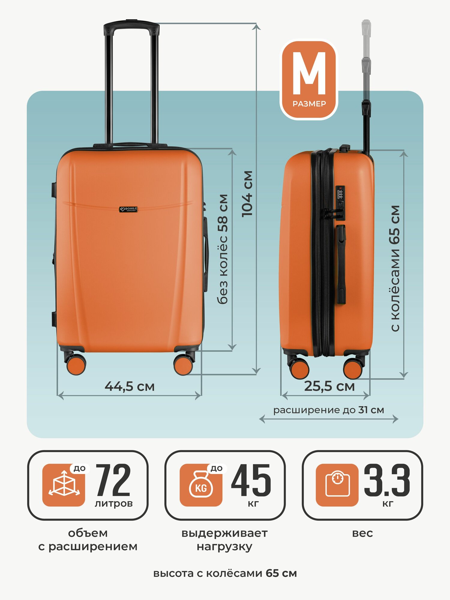 Чемодан Bonle, 62 л, размер S/M, оранжевый информация: