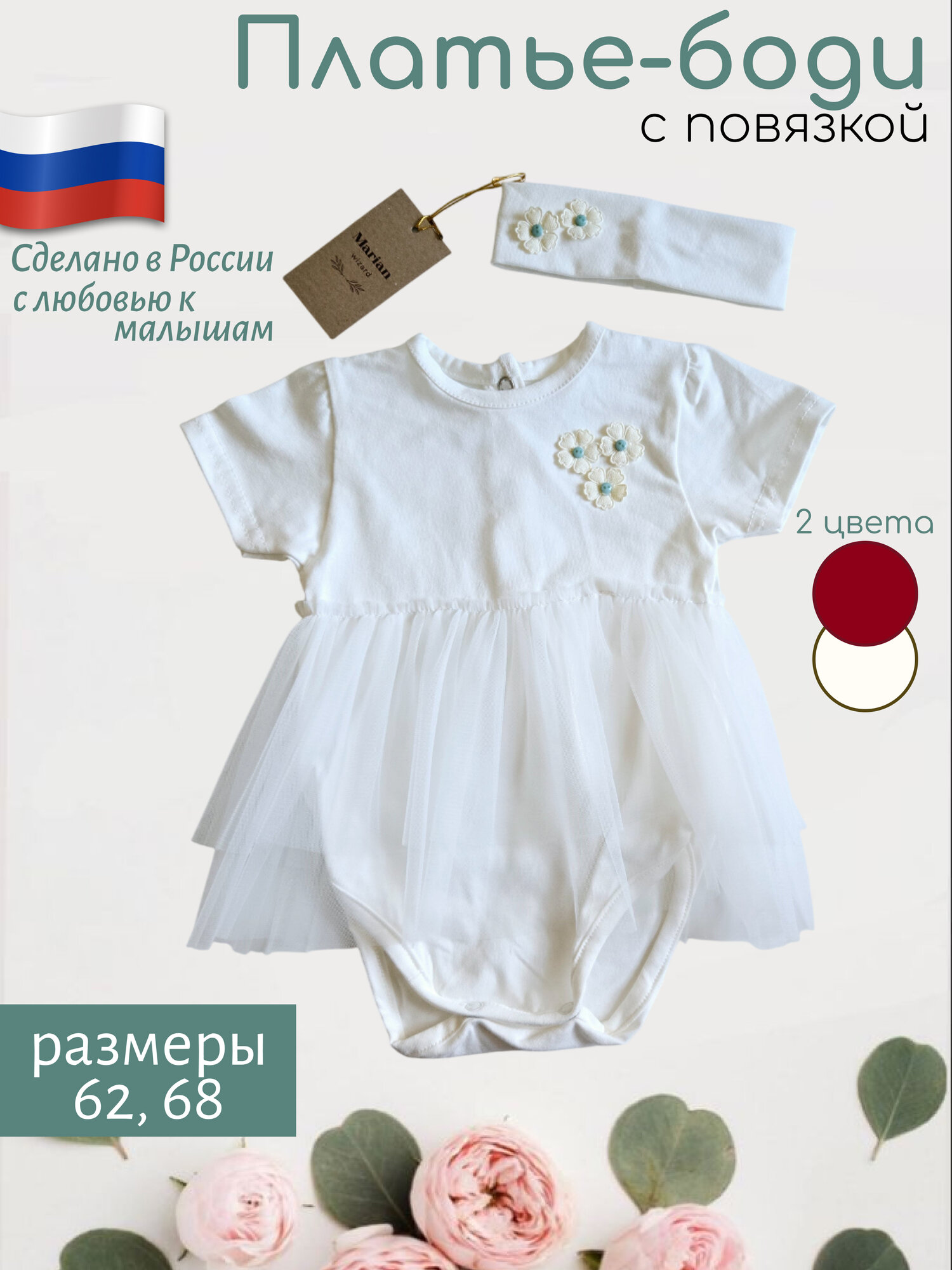 Боди Marianwizard Платье-боди с повязкой на голову в комплекте 100% хлопок производство Россия, размер 62, молочный 1 550 ₽