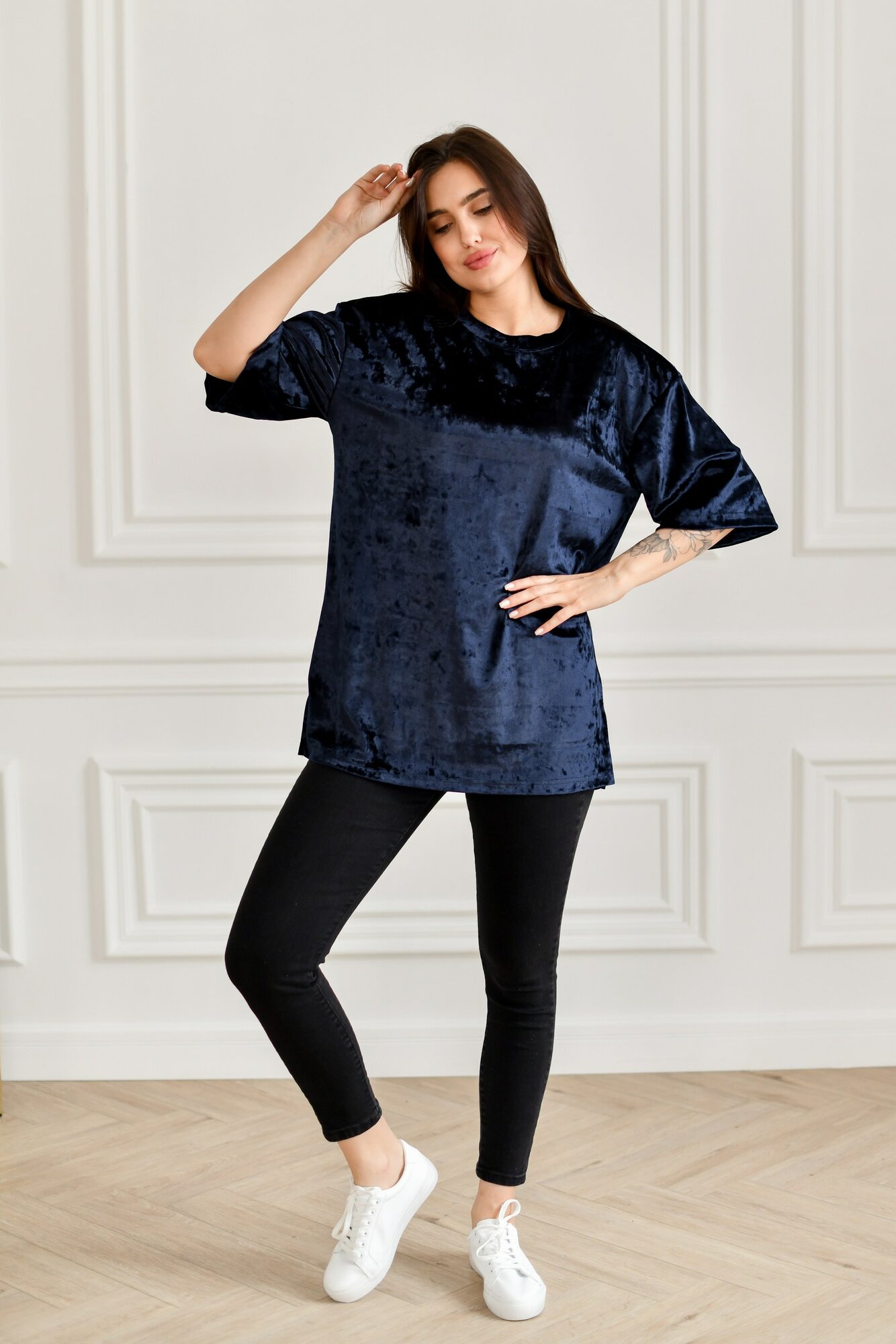 Характиристики этого товара не найдены!Отзывы на Футболка BUY-TEX.RU женская, велюровая, оверсайз, размер 46, cиний
