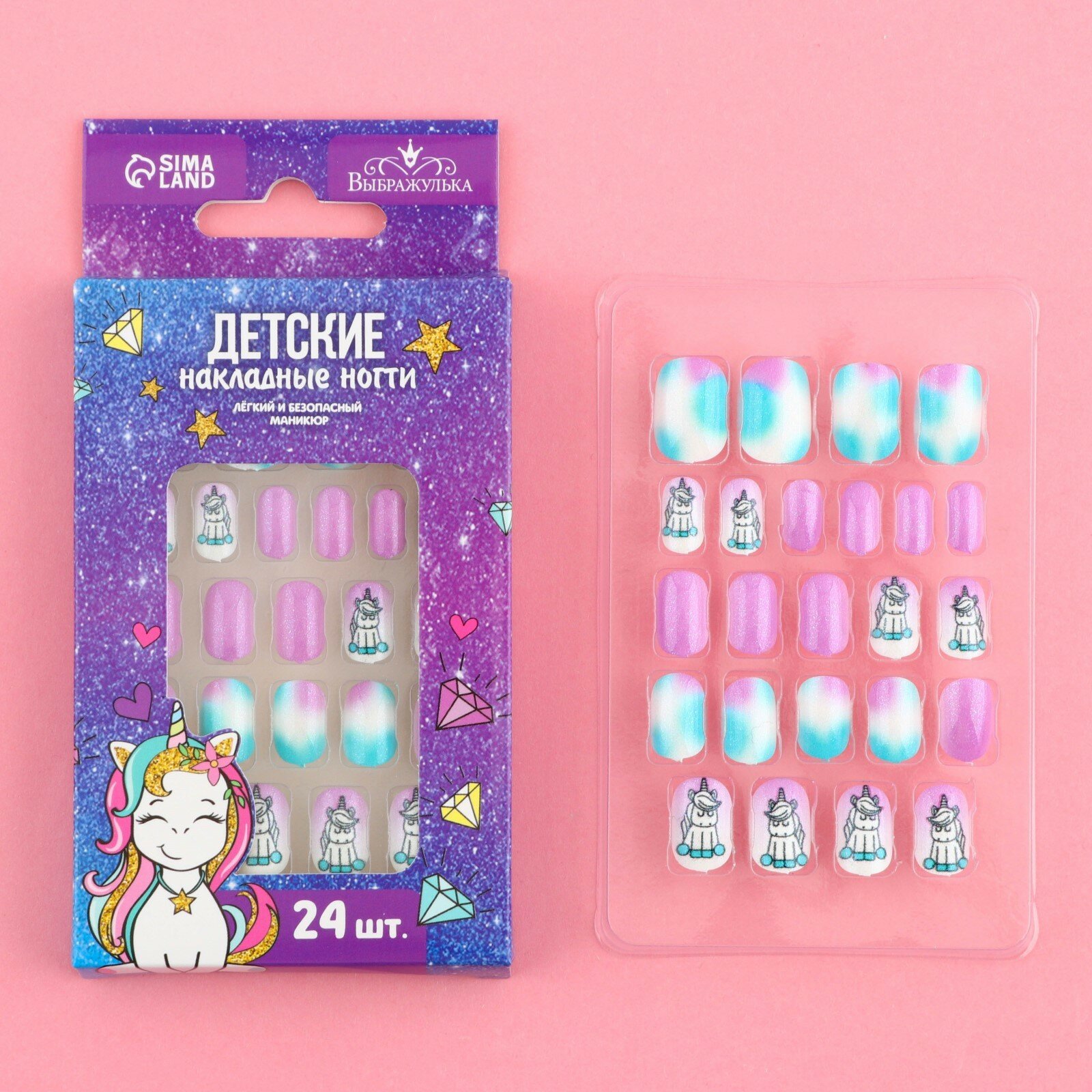 Накладные ногти Выбражулька "Единорожек" для детей, с дизайном, 24 шт. информация: