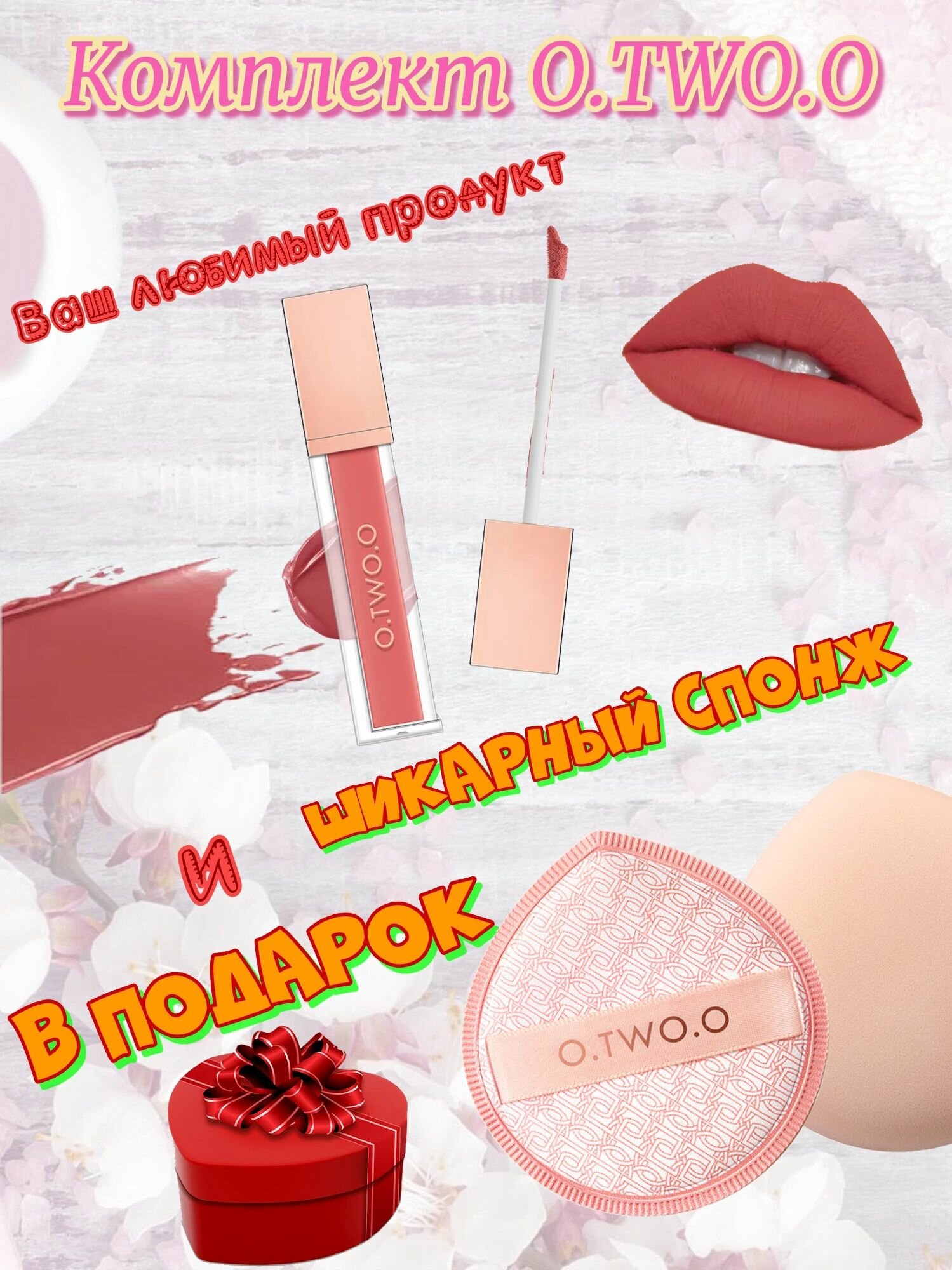 Набор O.TWO.O: Матовый тинт для губ, тон 08(Кремово-Оранжевый),5гр + спонж в подарок. информация: