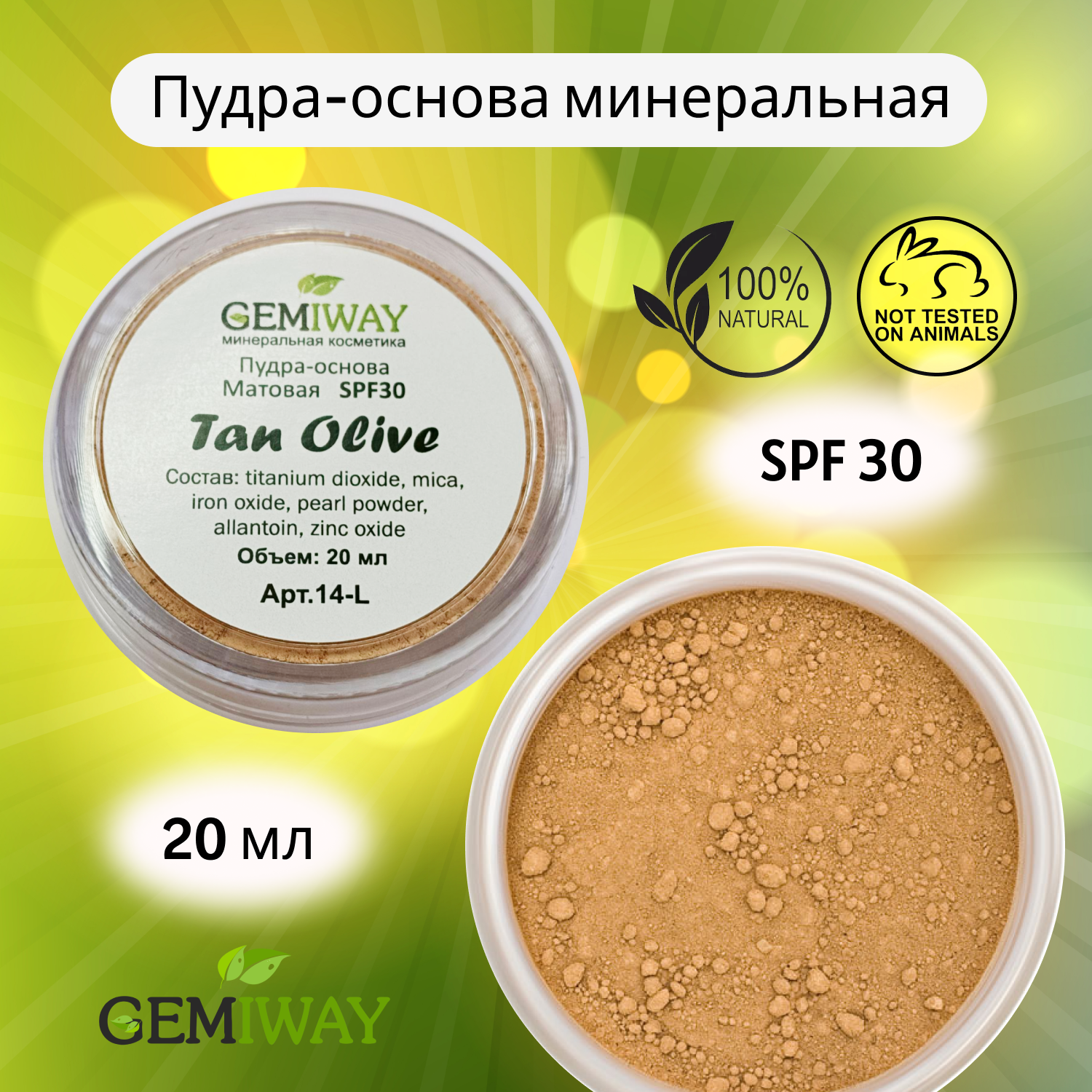 Пудра-основа минеральная Матовая "Tan Olive" GEMIWAY 20 мл / 4 г ( SPF 30 ). Рассыпчатая, натуральная пудра для лица информация: