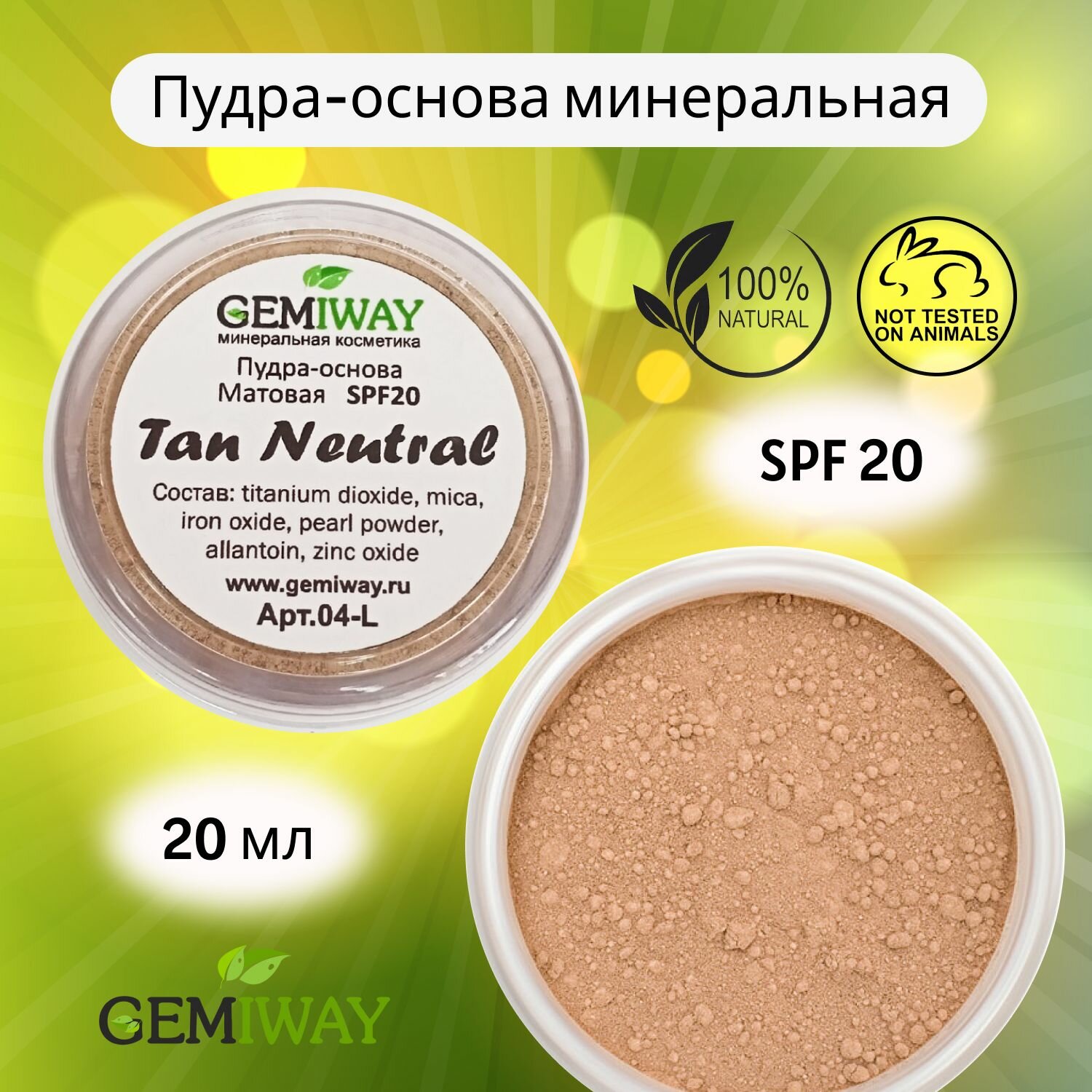 Пудра-основа Матовая минеральная "Tan Neutral" GEMIWAY 20мл / 4 г . SPF 20 . Рассыпчатая, натуральная пудра для лица информация: