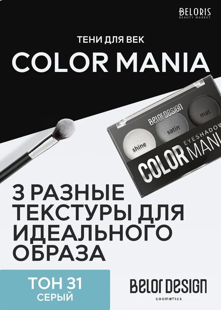 Тени для век Belor Design COLOR MANIA, тон 31 серый ,3 цвета, сатиновые, аппликатор в комплекте информация: