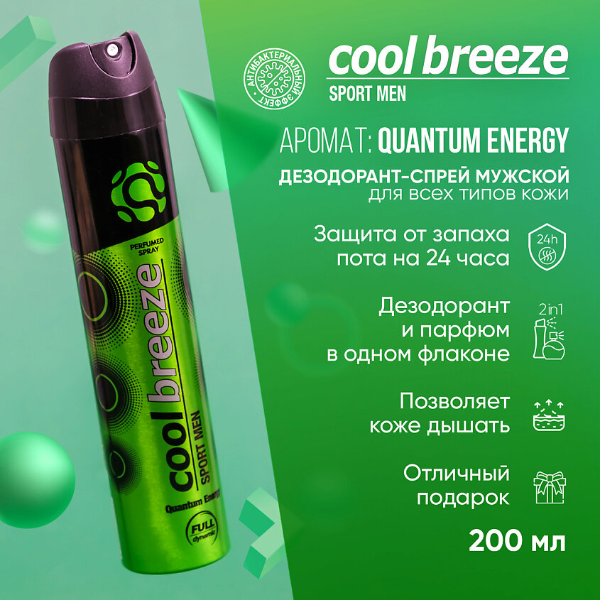 10 цен на Дезодорант мужской спортивный COOL BREEZE Sport Men Quantum Energy 200 мл Для спорта, парфюмированный цветочно-древесный