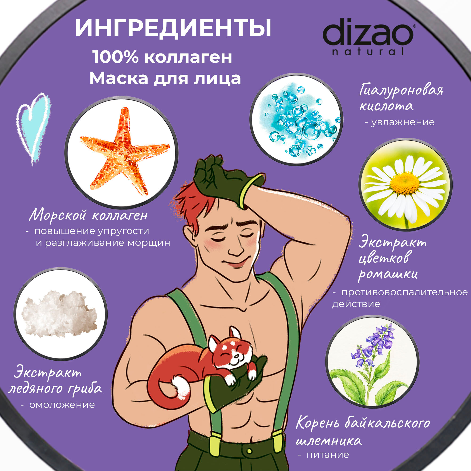 Маска для лица, шеи и подбородка тканевая для мужчин набор Dizao "100% Коллаген" 5 шт. информация: