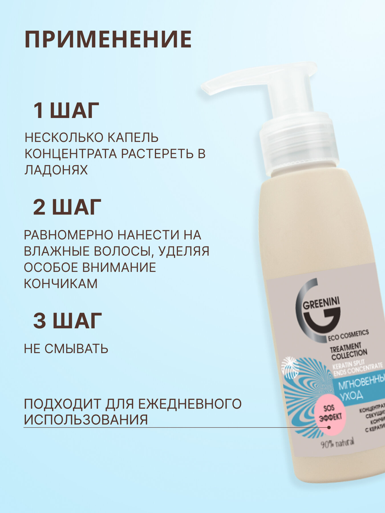 Greenini Концентрат от секущихся кончиков с кератином sos-эффект мгновенное действие 90% Natural 100мл информация: