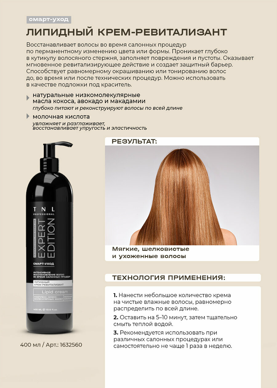 TNL, Expert Edition - липидный крем-ревитализант для волос с натуральными маслами, 400 мл информация: