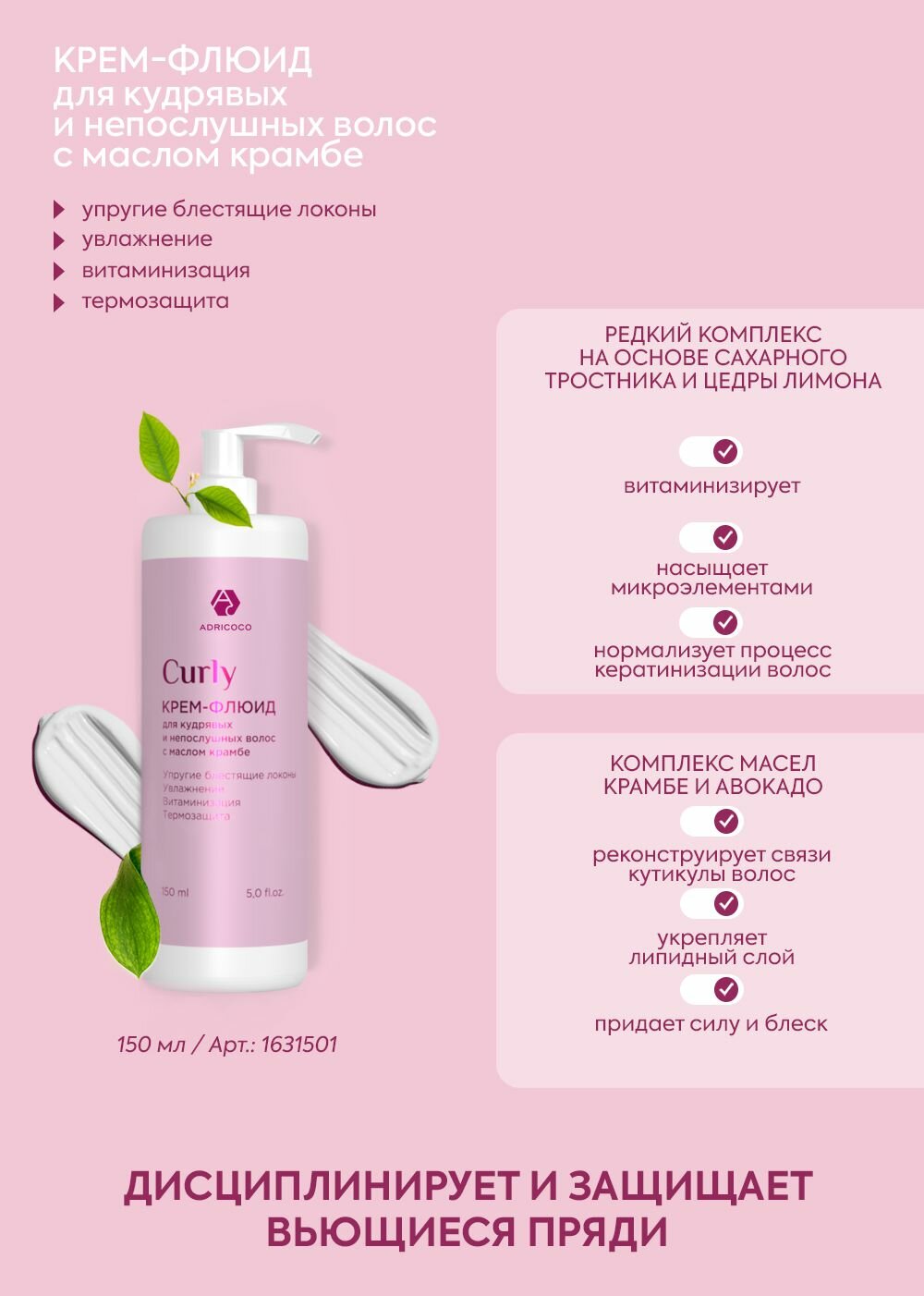 Adricoco, CURLY - крем-флюид для кудрявых и непослушных волос, с маслом крамбе, 150 мл информация: