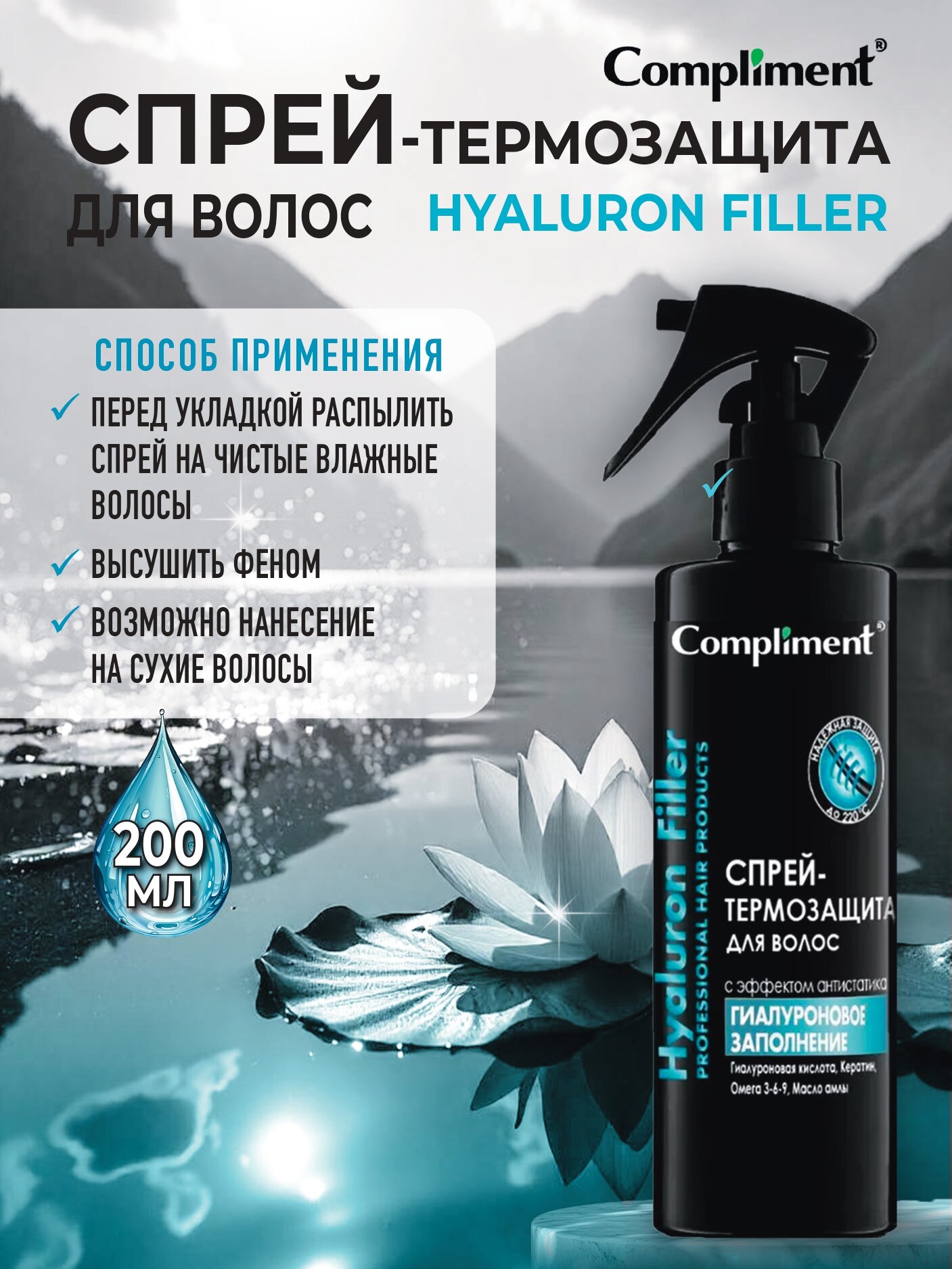 Отзывы на Compliment Спрей-термозащита для волос c эффектом антистатика Hyaluron Filler Гиалуроновое заполнение, 200мл