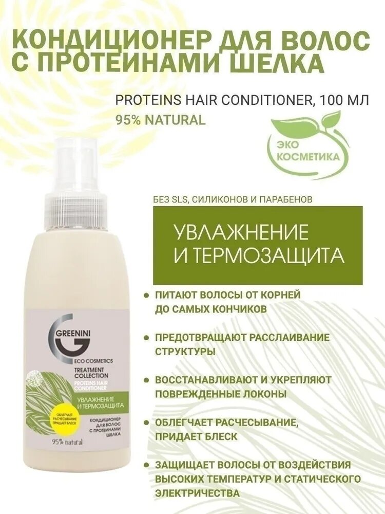 10 цен на Greenini Кондиционер для волос с протеинами шелка Увлажнение и термозащита 95% Natural 100мл