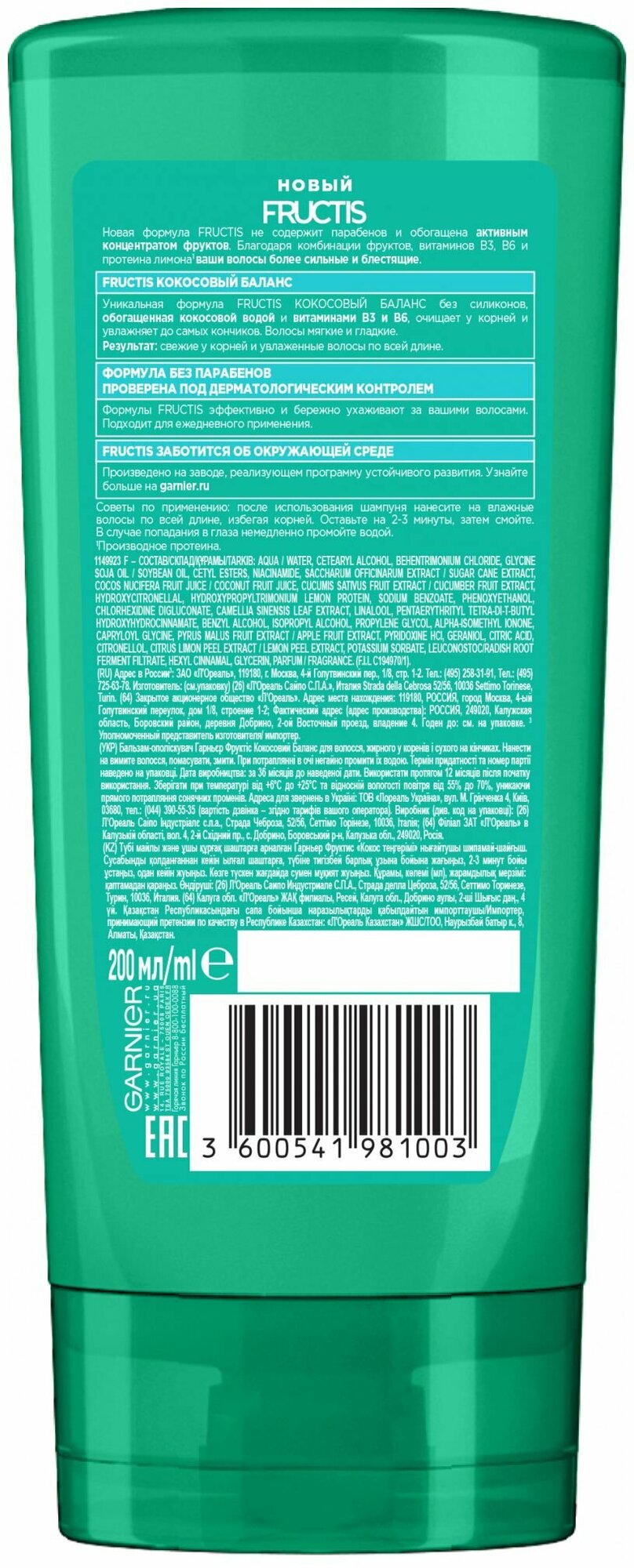 Бальзам-ополаскиватель укрепляющий Garnier Fructis Кокосовый Баланс 200 мл, 3 шт информация: