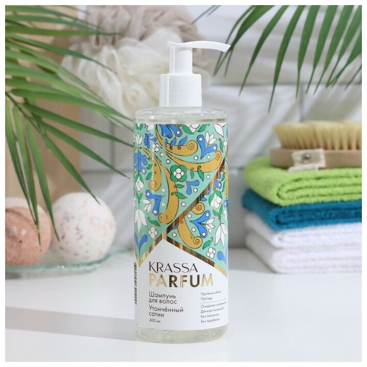 10 цен на Krassa Parfum Шампунь для волос Утончённый Сатин с протеинами шёлка и пептидами, помпа 400 мл