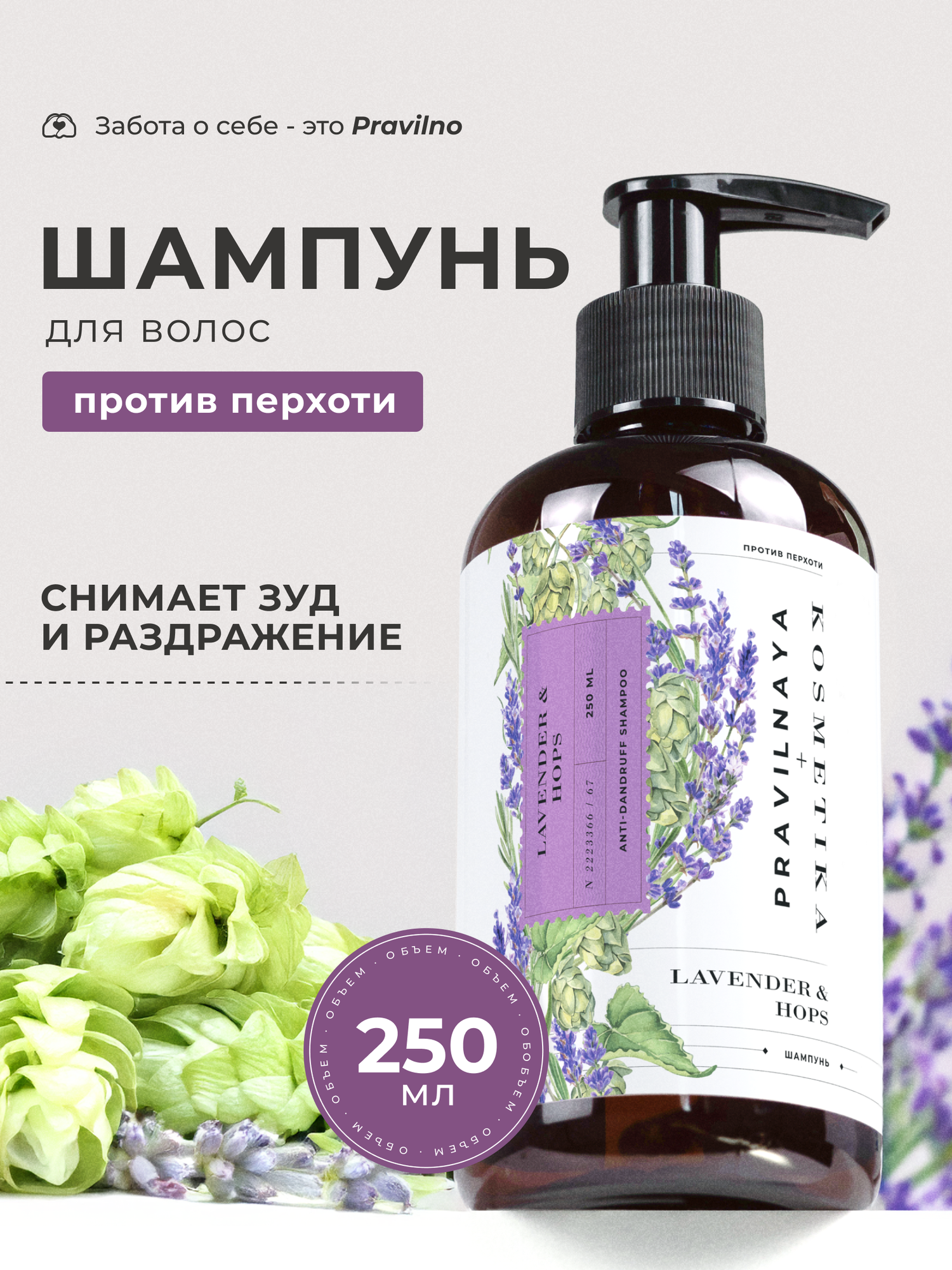 Шампунь для всех типов волос против зуда и перхоти Pravilnaya Kosmetika с ментолом, Лаванда и хмель, 250 мл информация: