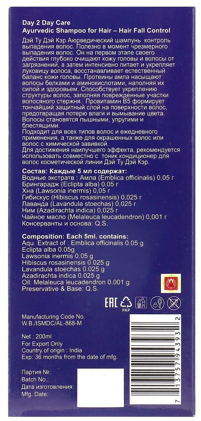 Шампунь Day 2 Day Care Аюрведический Контроль выпадения волос, 200 мл информация: