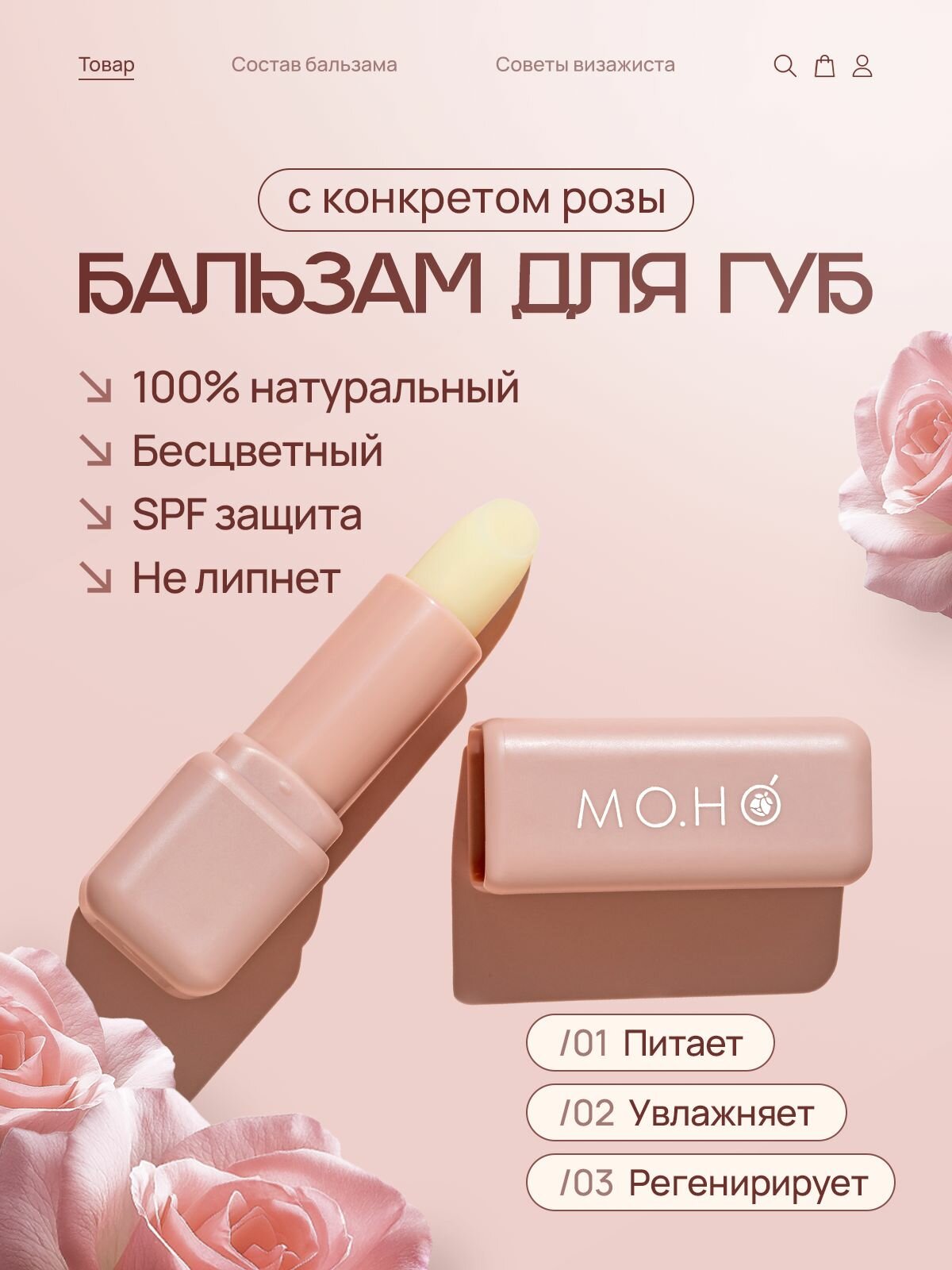 Отзывы на Бальзам для губ MO. но восстанавливающий и увлажняющий, с конкретом розы и маслом ШИ (карите), бежевый