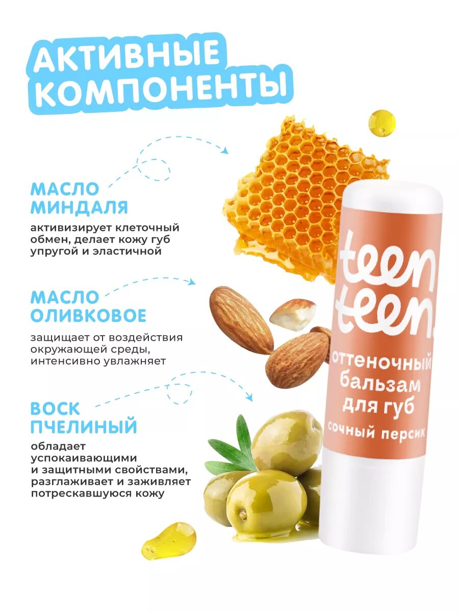 Оттеночный бальзам для губ Teen-teen Сочный персик, увлажнение, питание, защита, оттенок персик, 3,5г Дом Природы информация: