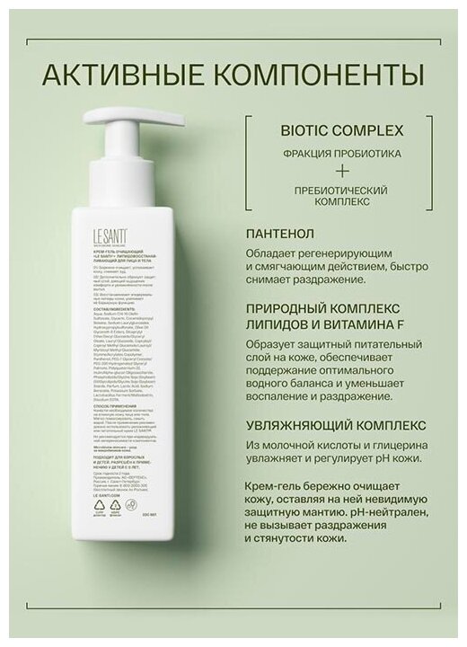 LE SANTI крем-гель очищающий липидовосстанавливающий для лица и тела, флакон 200 мл информация: