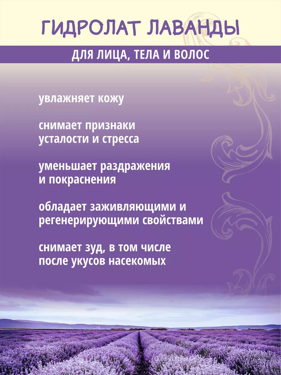 Гидролат Лаванды для лица и волос, уменьшает раздражение, снимает зуд, 100мл информация: