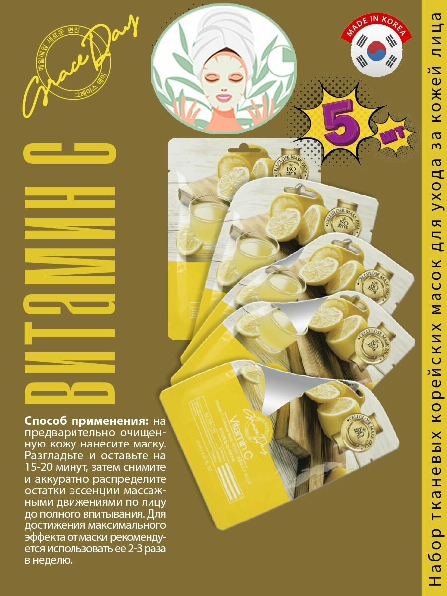 Grace Day Подарочный набор: Тканевая маска для ухода за кожей лица с витамином С, корейская косметика. 5 шт