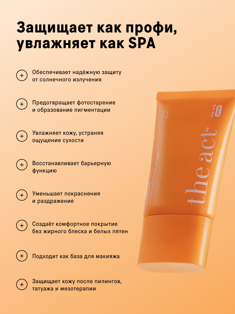 Солнцезащитный крем для лица SPF 50 The Act, легкий, без белых следов, 60 мл информация: