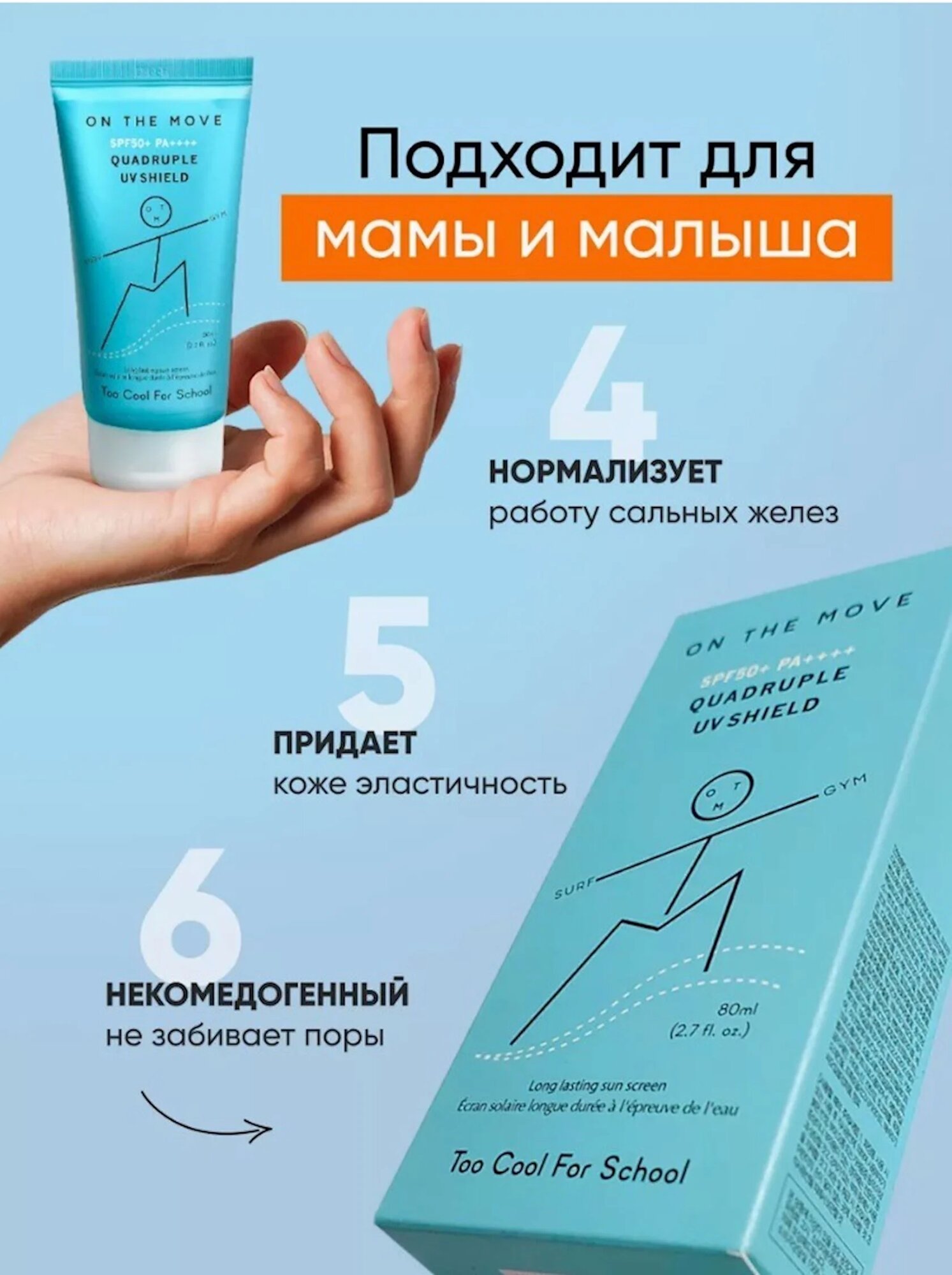 Too Cool For School Солнцезащитный крем On The Move Quadruple UV Shield SPF50+ 80ml информация: