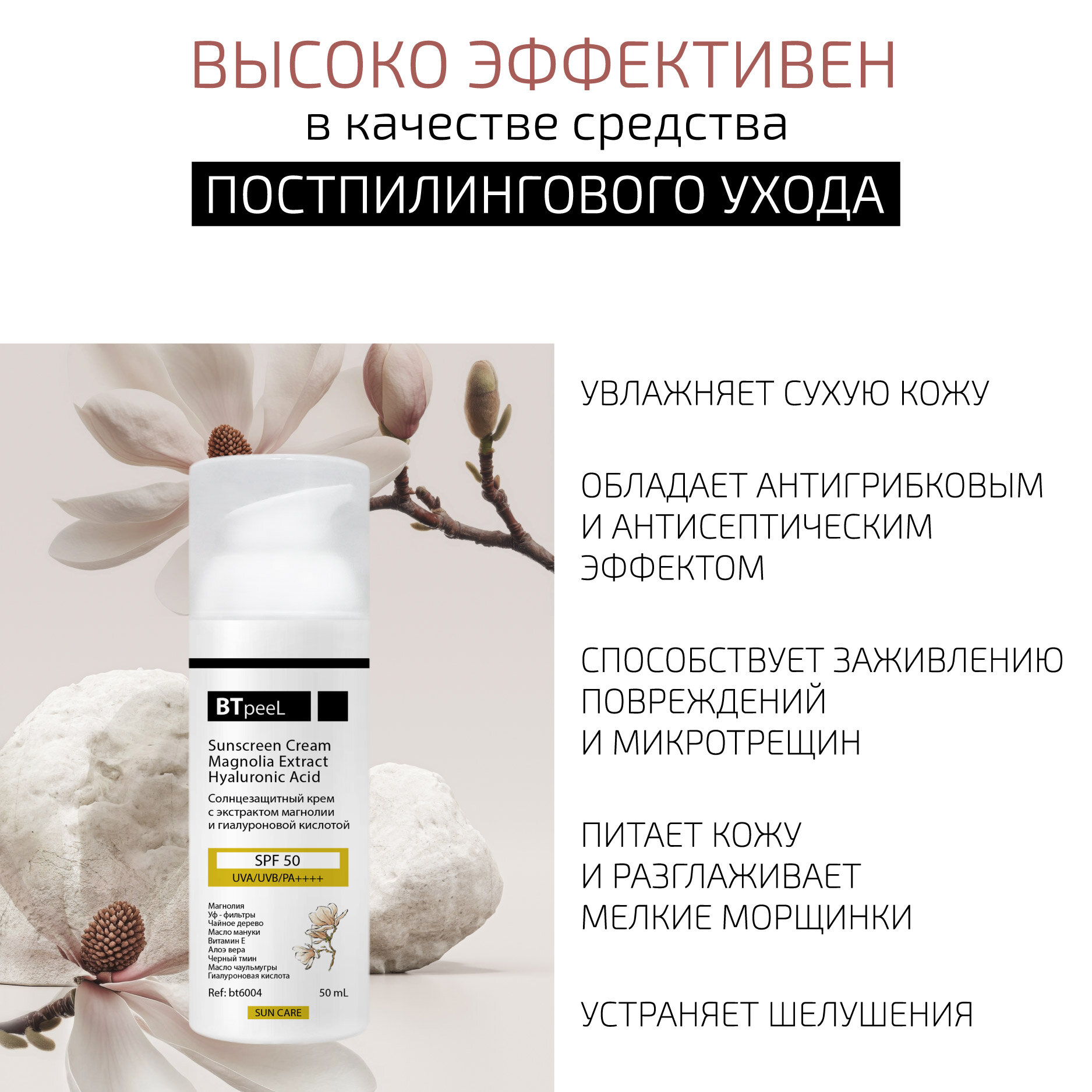 Солнцезащитный увлажняющий крем с экстрактом магнолии и гиалуроновой кислотой SPF-50 UVA/UVB/PA++++ BTpeel, 50 мл информация: