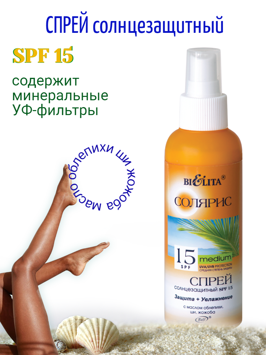 Солнцезащитный спрей Bielita "Солярис", SPF15, с маслом облепихи, 145 мл информация: