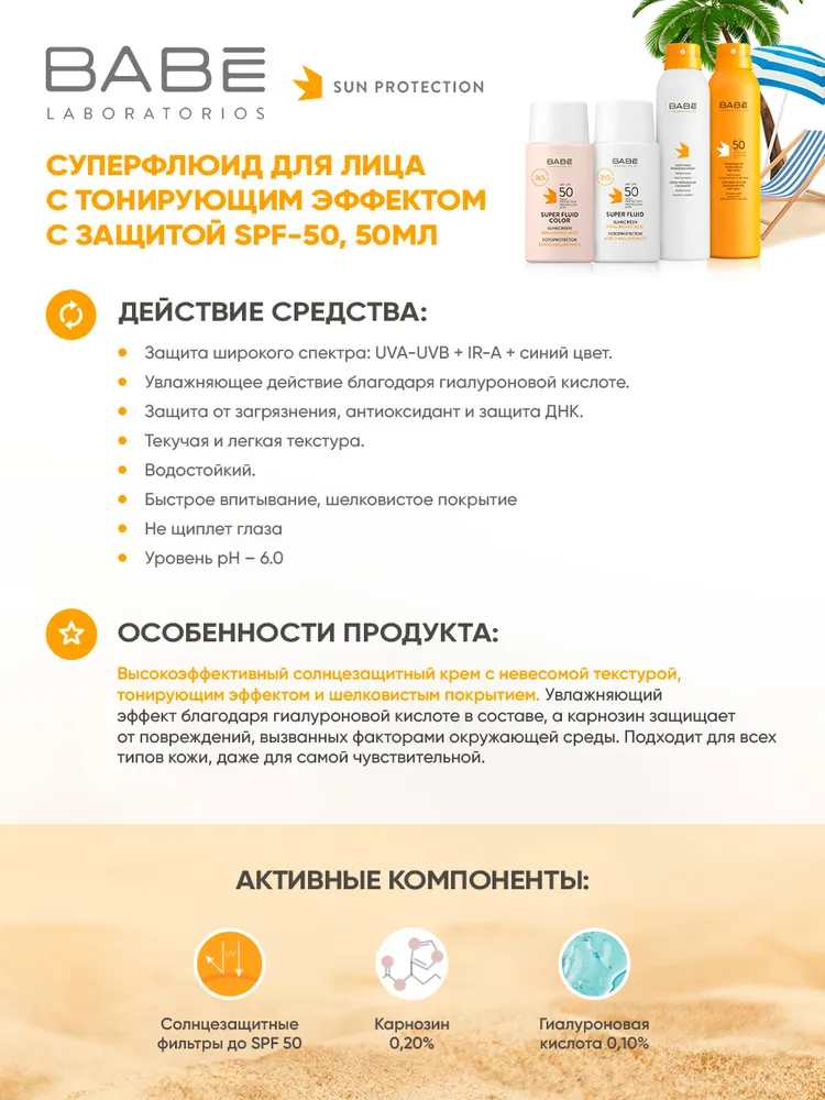 Солнцезащитный супер флюид крем для лица с тонирующим эффектом с защитой SPF 50, BABE Laboratorios 50 мл аптека асна информация:
